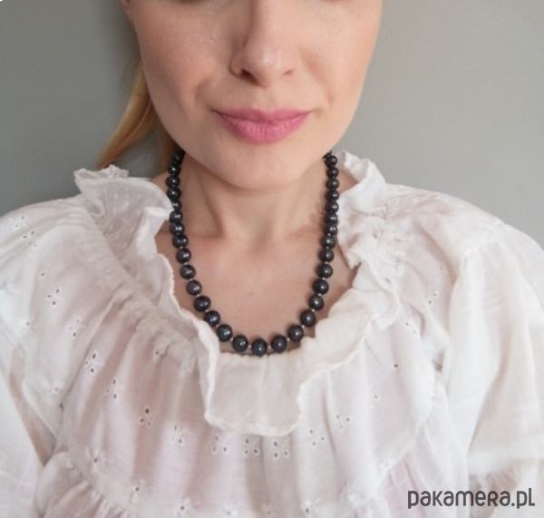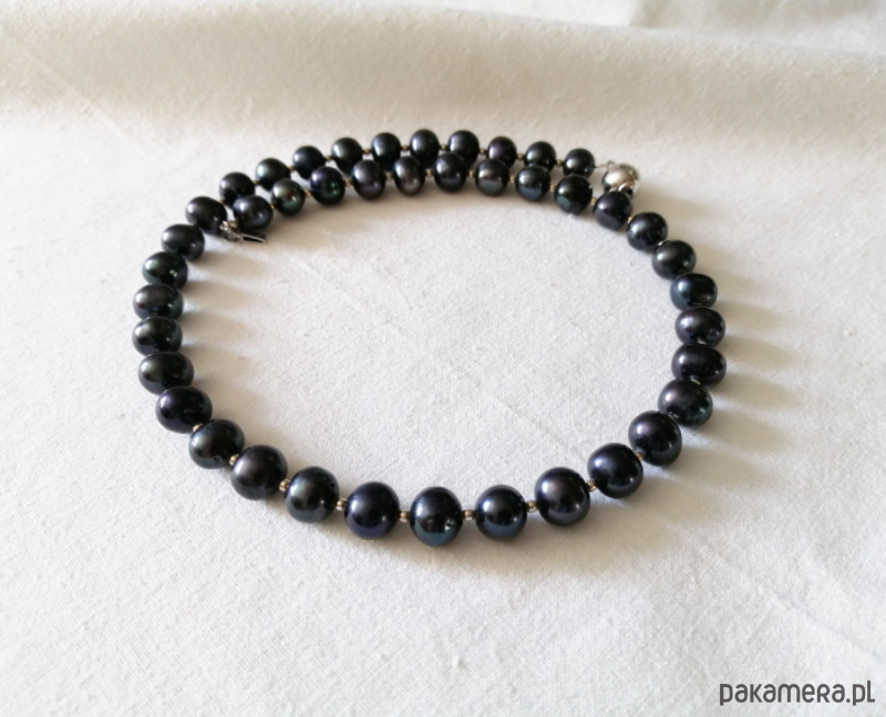 Naszyjnik wykonany z naturalnych, słodkowodnych grafitowych pereł ze srebrnymi przekładkami.