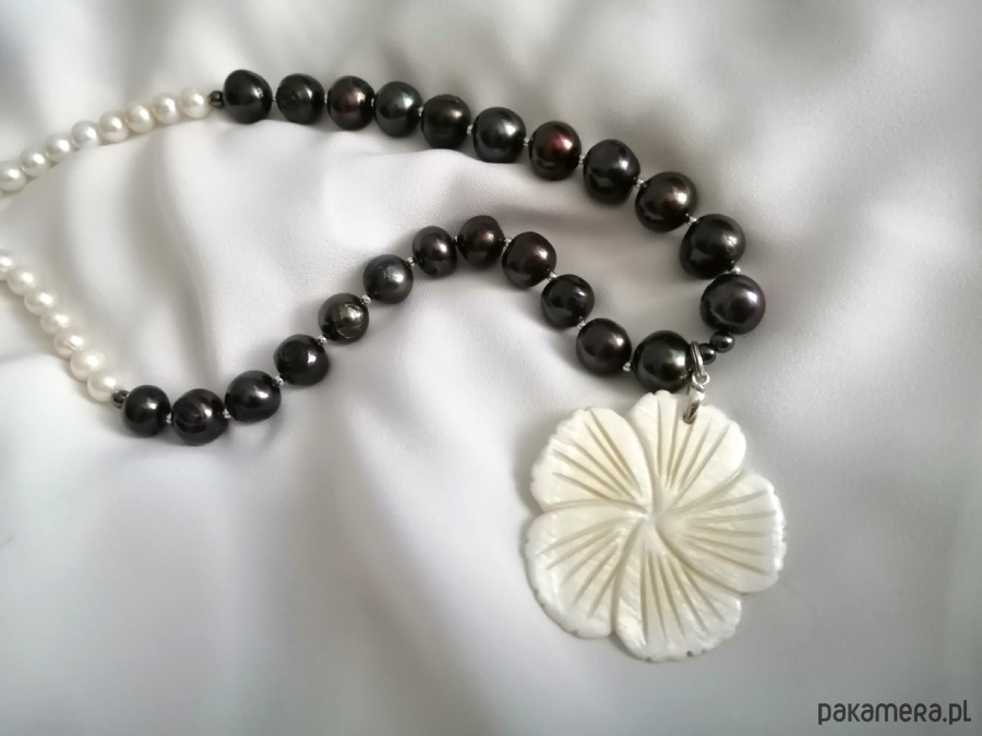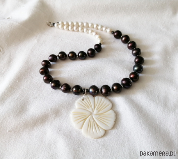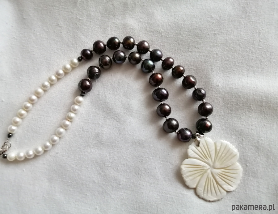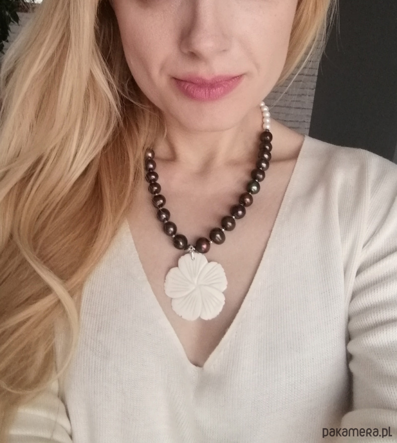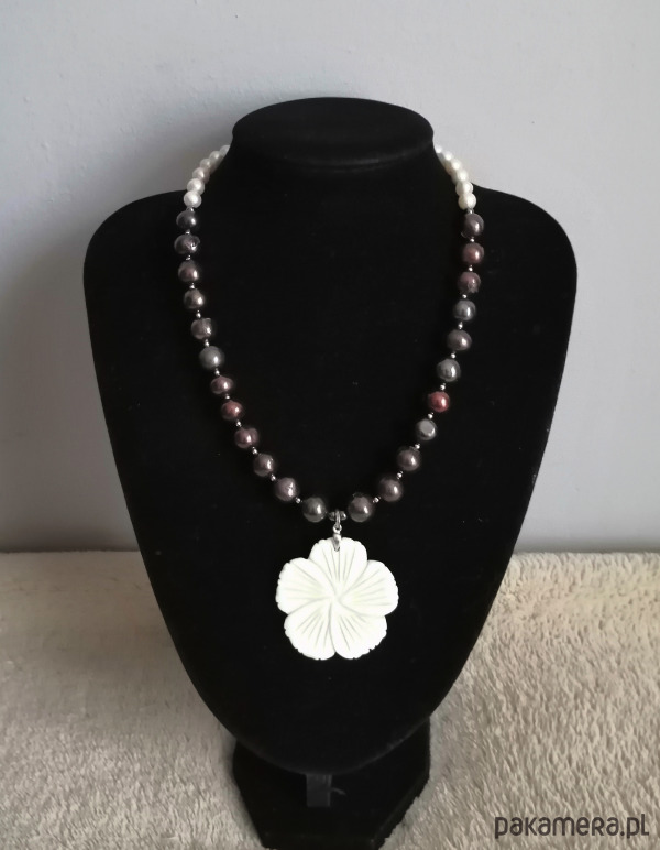 Naszyjnik wykonany z pereł białych i brązowych. Zawieszka wykonana jest z masy perłowej.
