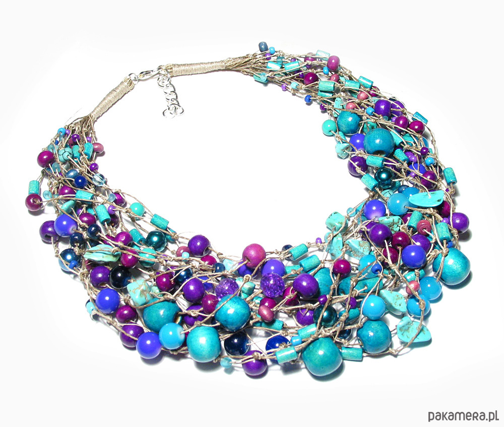 Naszyjnik dla marzycielki, miłośniczki natury i kobiety z wyobraźnią. Wykonany na naturalnej przędzy lnianej z elementów w odcieniach błękitów, lazuru i granatów. W naszyjniku znajdują się korale szklane, drewniane, szklane perełki, turkus, howlit . Długość ok. 52 cm, regulacja długości, zapięcie posrebrzane.
