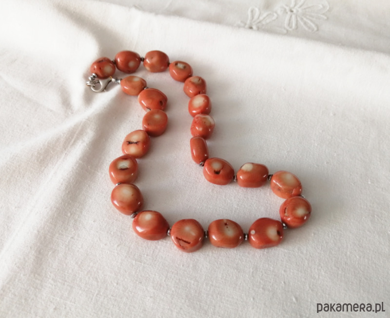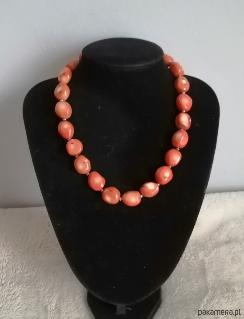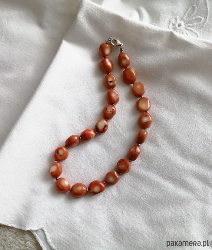 Naszyjnik wykonany z pomarańczowego korala i hematytu.