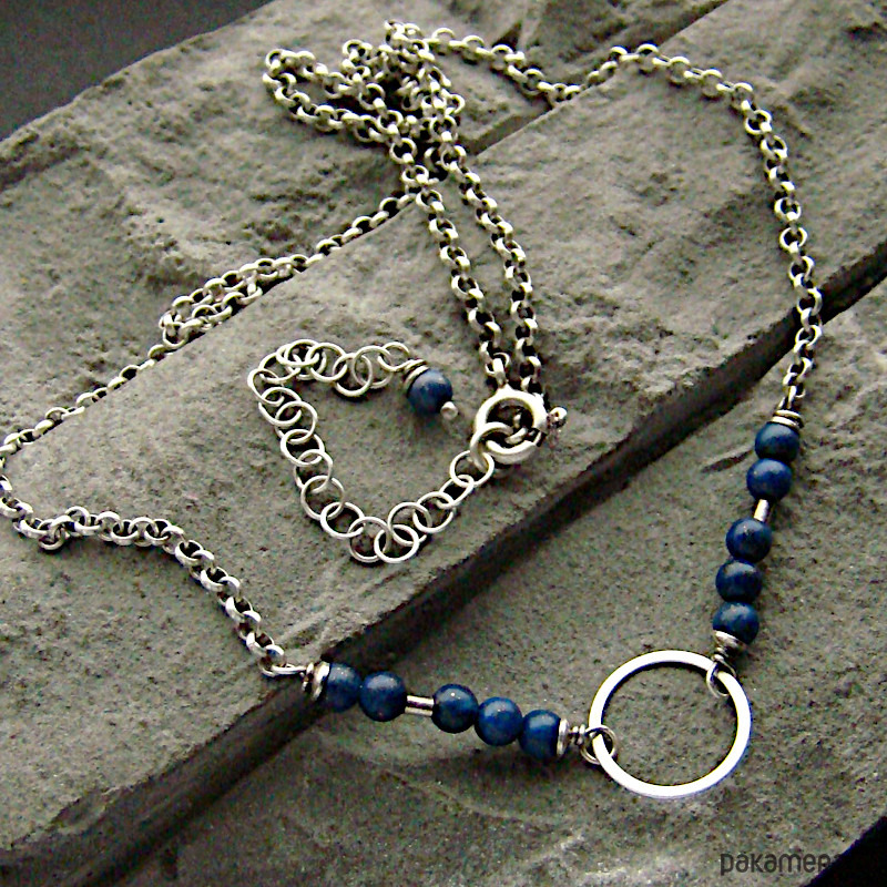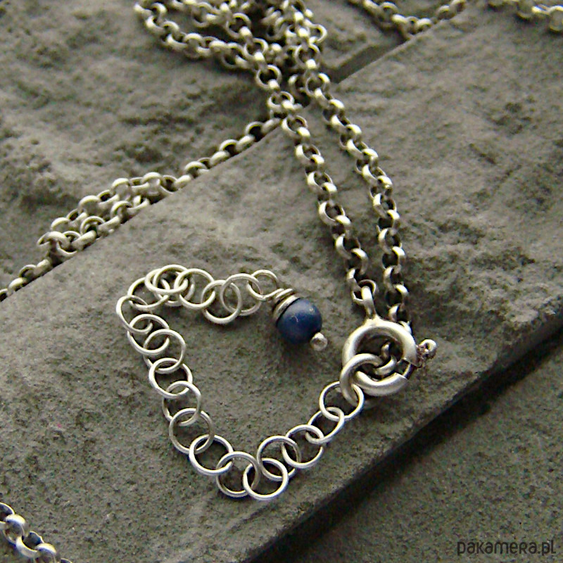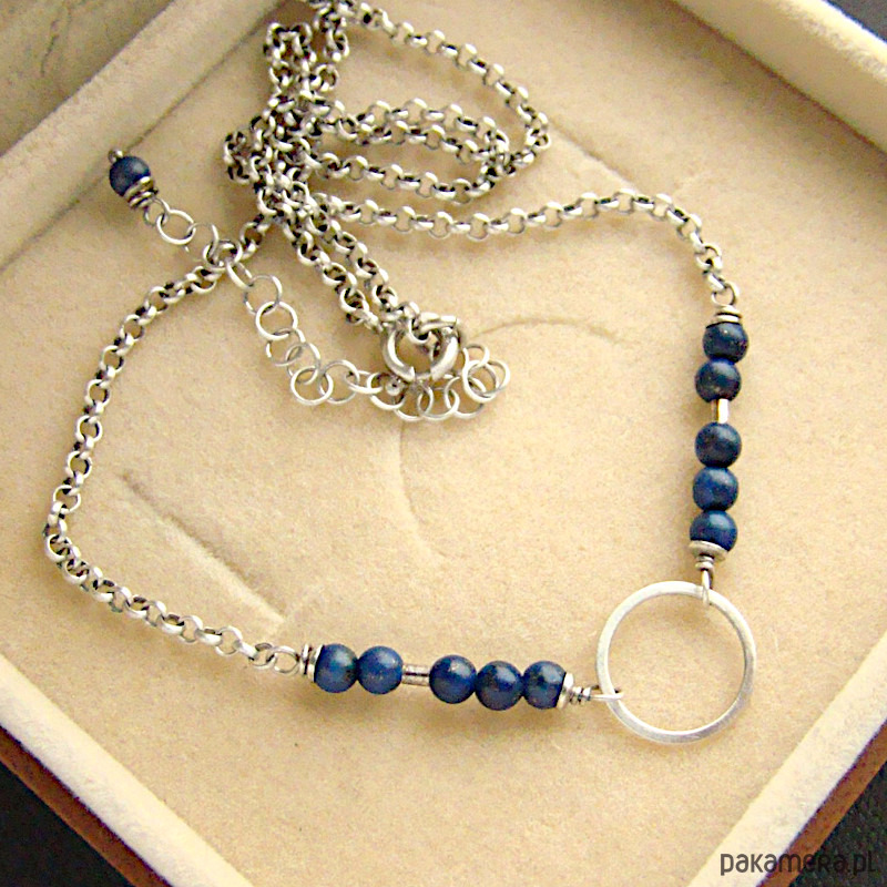 Subtelny i kobiecy naszyjnik na co dzień i nie tylko. Wykonany w całości z oksydowanego srebra próby 925 oraz kulek lapisu lazuli wielkości ok. 3,5 mm. Wielkość koła to 1,2 cm . Obwód łańcuszka to 42 cm plus regulacja 5 cm. W mojej galerii kolczyki i bransoletka do kompletu. Ozdobnie zapakowany.