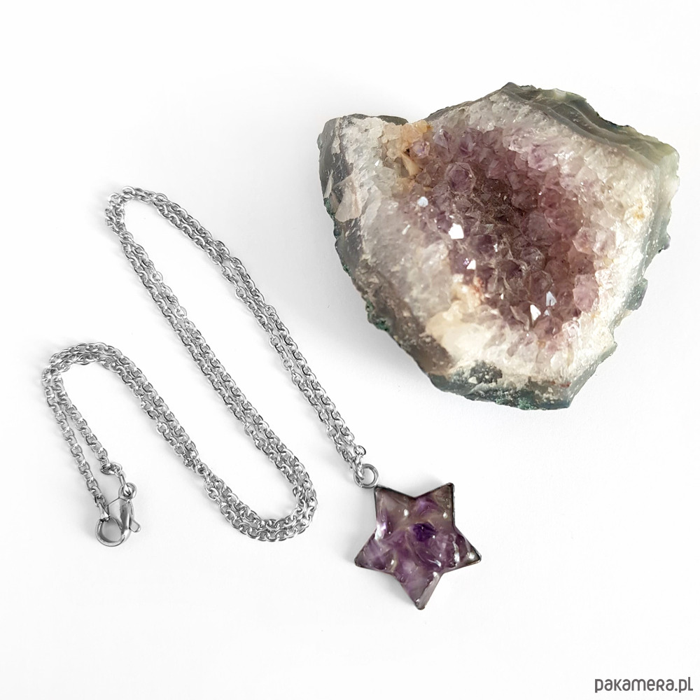 Naszyjnik wykonany z ametystu w formie bryłek zatopionych w żywicy oraz elementów metalowych ze stali chirurgicznej.