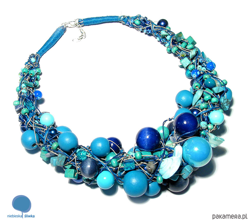 Zatopiony w błękitach, lazurach i granatach. Naszyjnik lniany wykonany w formie zbliżonej do kolii. Powstał na bazie kilku kolorów przędzy (lazur, granat i odcień naturalnego lnu). W splocie znajdują się elementy akrylowe, szklane, drewniane, crackle, muszle, szklane perełki, bryłki turkusa, howlitu, sodalitu i masy perłowej. Długość naszyjnika mierzona wewnątrz po zapięciu ok. 50 cm, dodatkowa regulacja długości, zapięcie posrebrzane. ------------- Wzór i projekt są strzeżone prawami autorskimi. Kopiowanie jest zabronione.