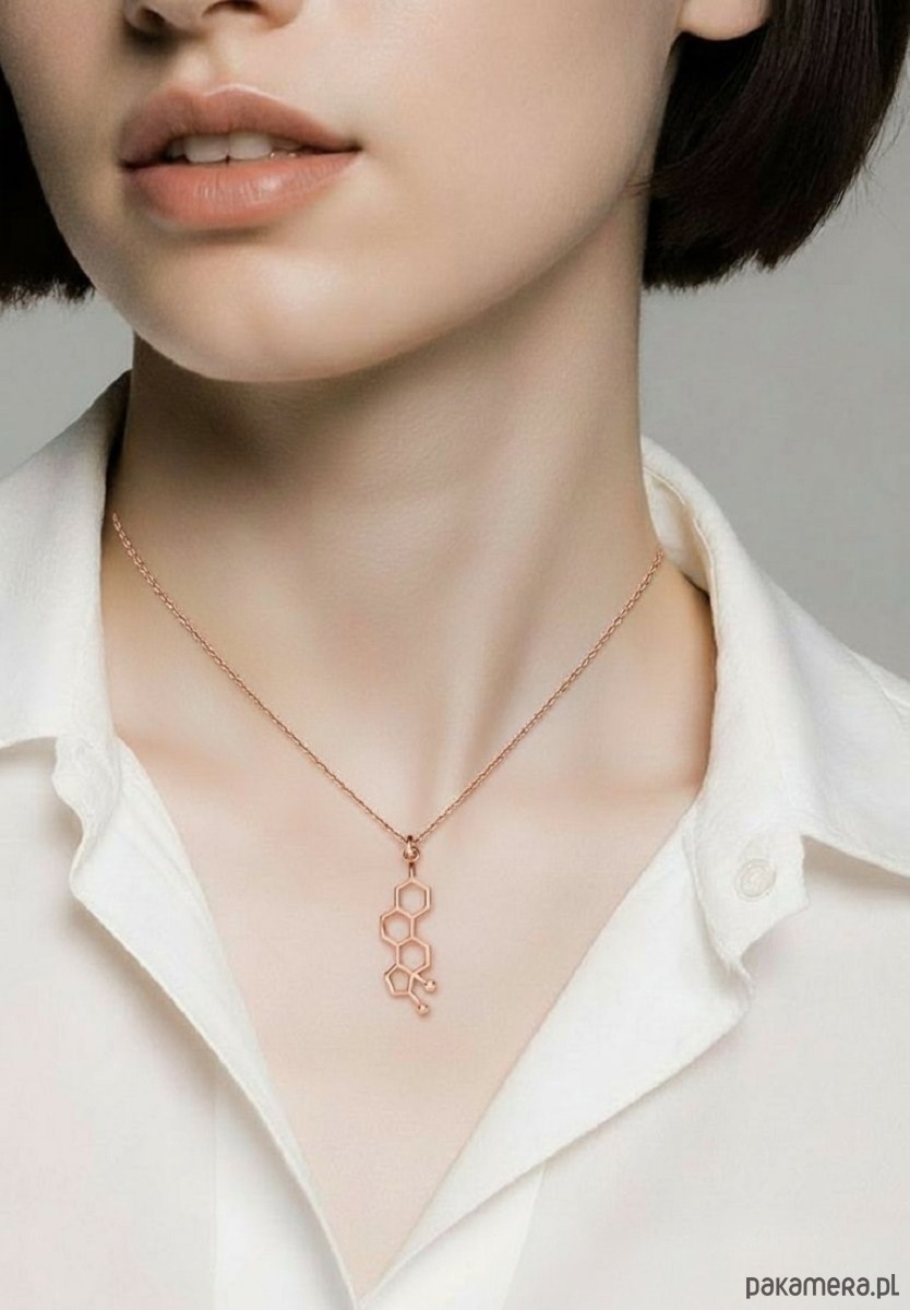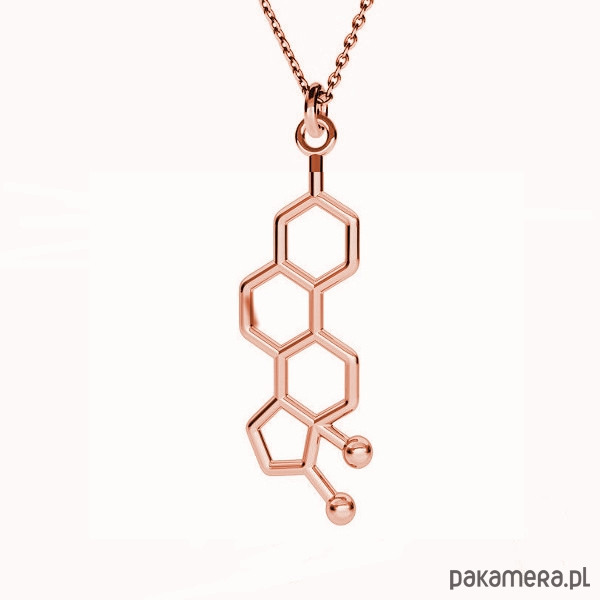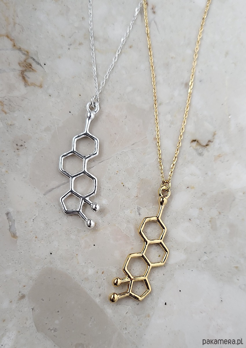 Naszyjnik z kolekcji CHEMISTRY, wykonany ze srebra próby 925 , dostępny również w wersji ze srebra pokrytego 24-karatowy złotem lub 18- karatowym różowym złotem. Zawieszka przedstawia wzór chemiczny cząsteczki żeńskiego hormonu- estrogenu.