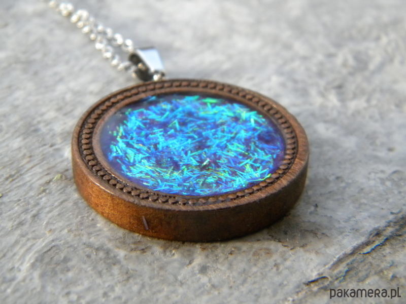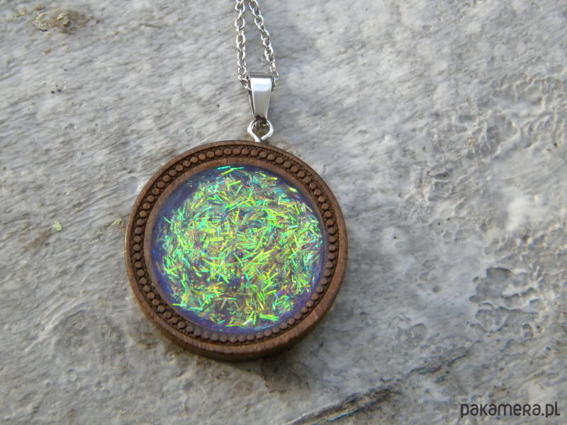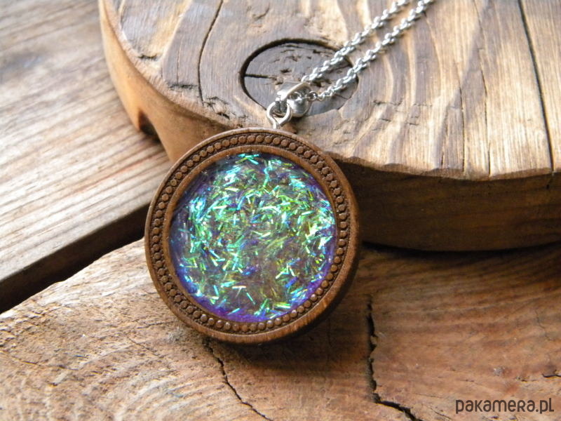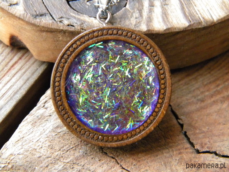 wisior z drewna i żywicy z wtopionymi holograficznymi drobinkami. Mieni się wieloma kolorami