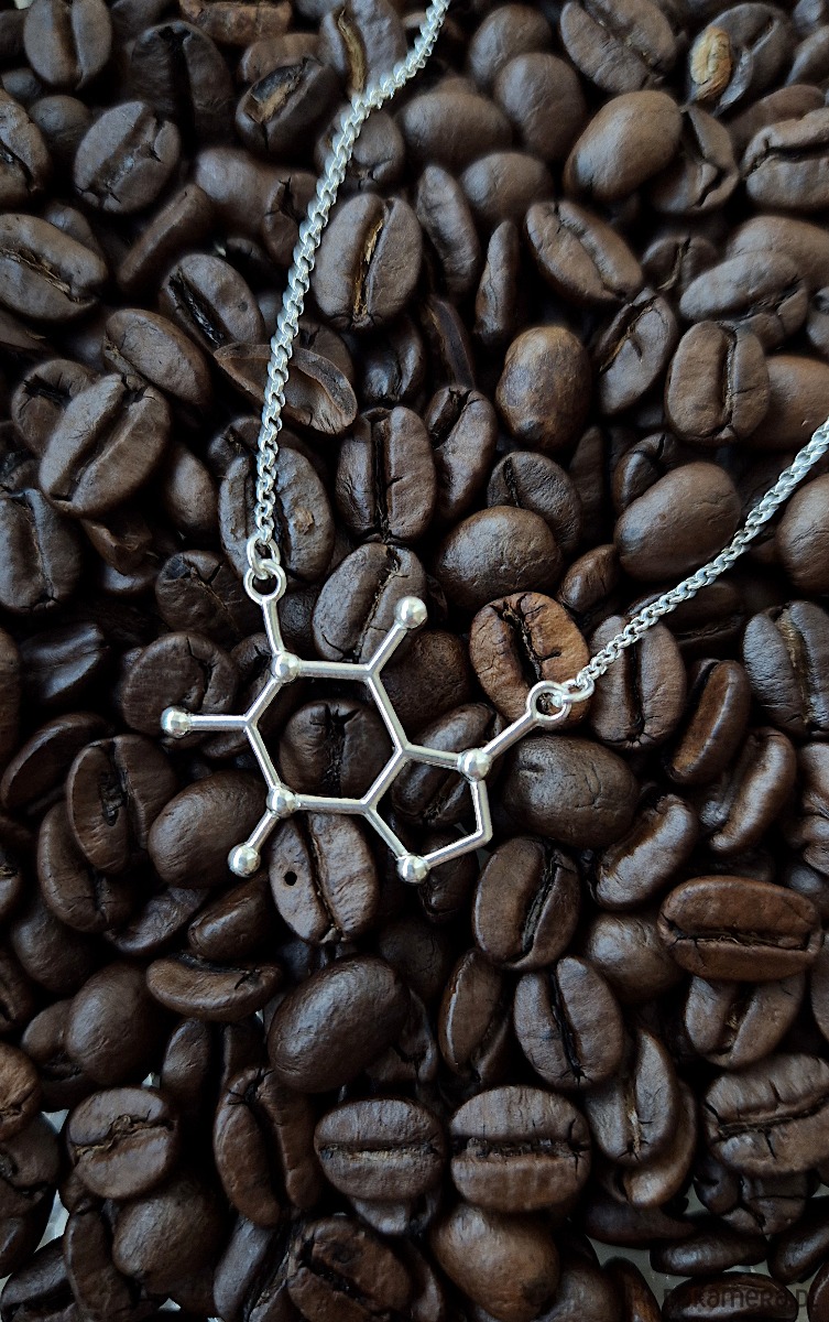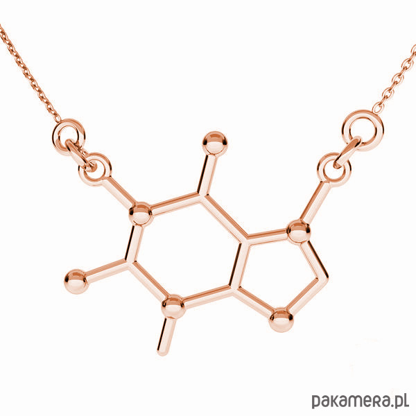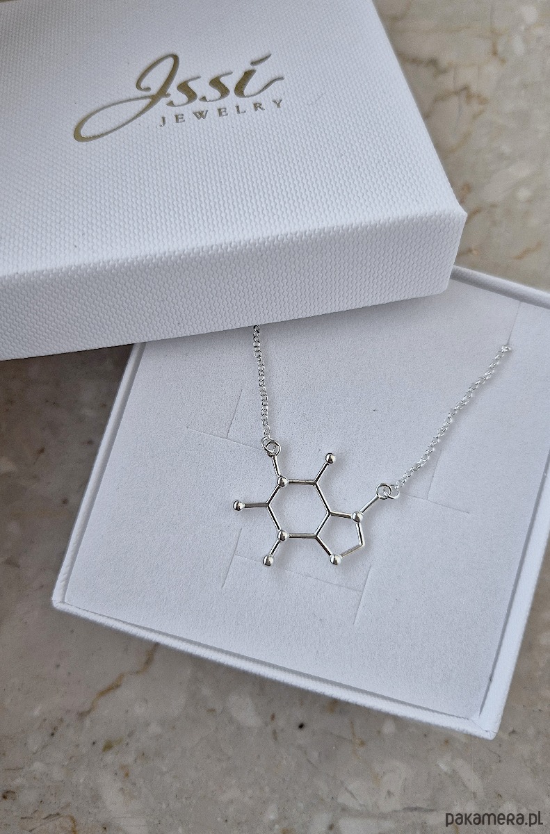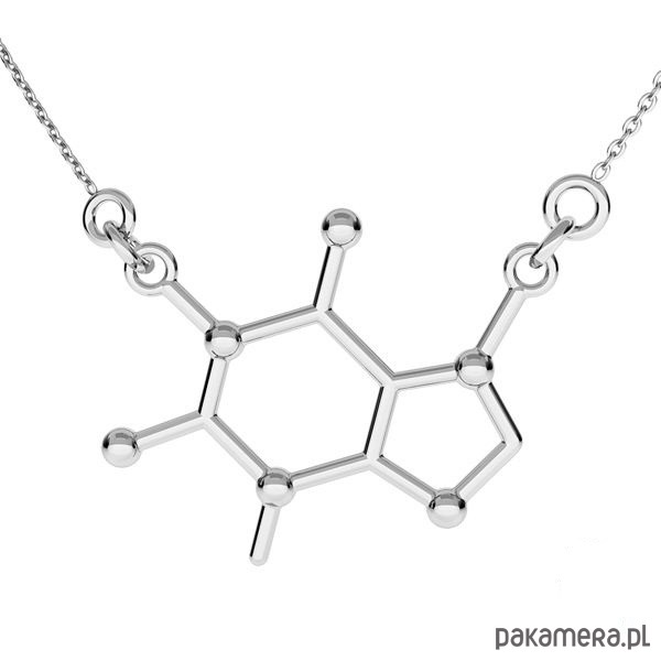 Naszyjnik z geometryczną zawieszką w kształcie wzoru molekularnego kofeiny.