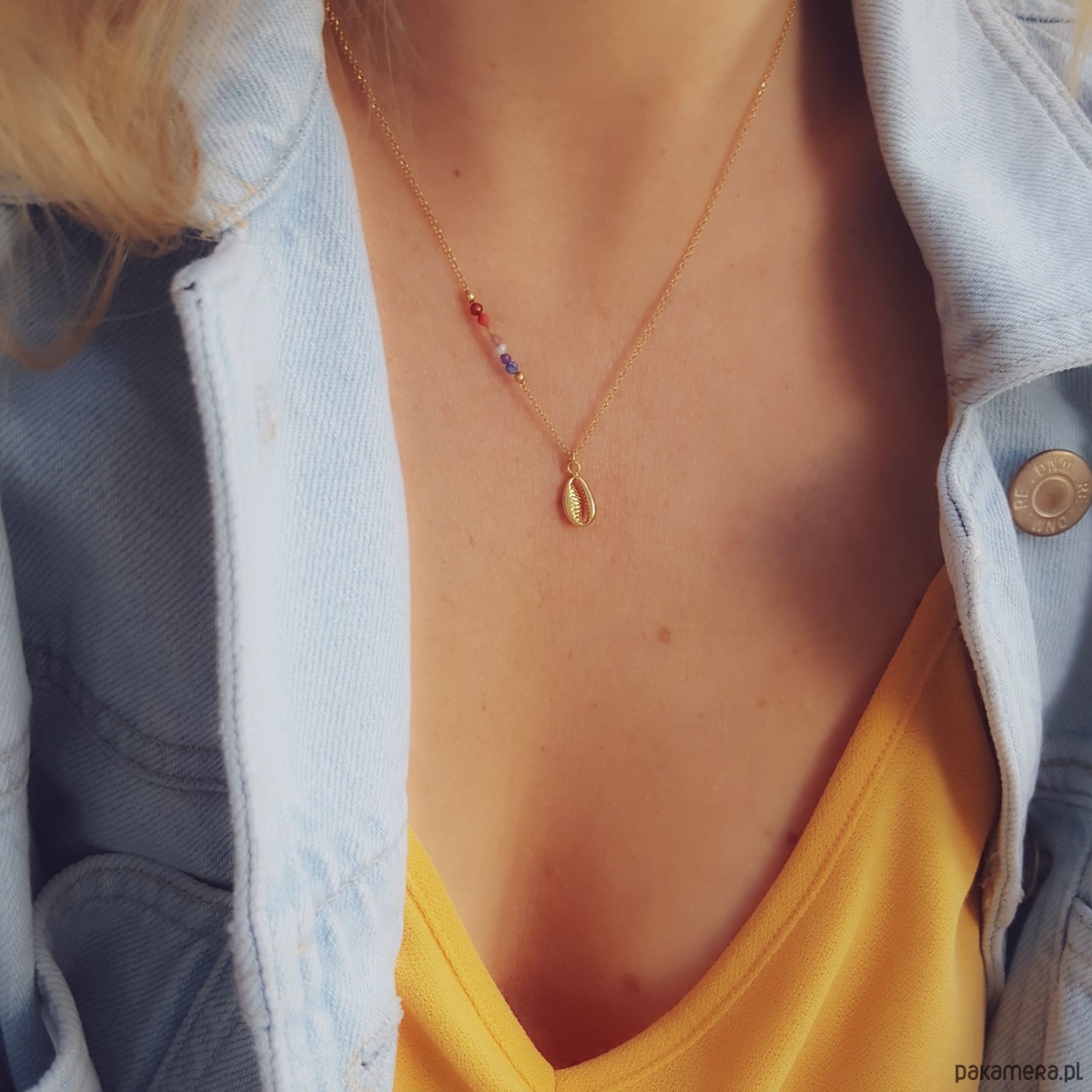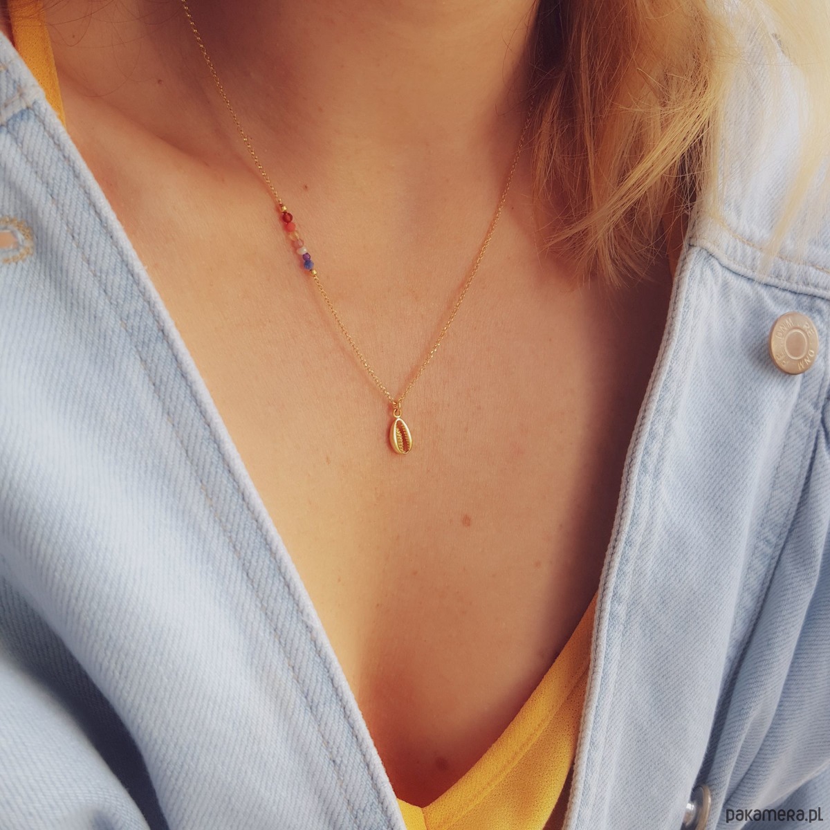 Kolorowy naszyjnik z muszelką wykonany ze srebra pozłacanego i kamieni szlachetnych. W łańcuszek wplecione zostały kamienie naturalne w intensywnych, energetycznych kolorach – niebieski, fioletowy, biały, różowy, żółty, czerwony i pomarańczowy. Wybór kolorów inspirowany był zachodem słońca nad morzem. Przy zapięciu znajduje się ozdobna blaszka z wygrawerowanym logo MiO.