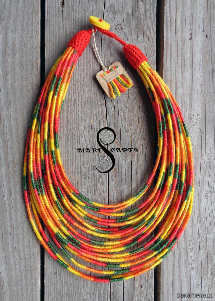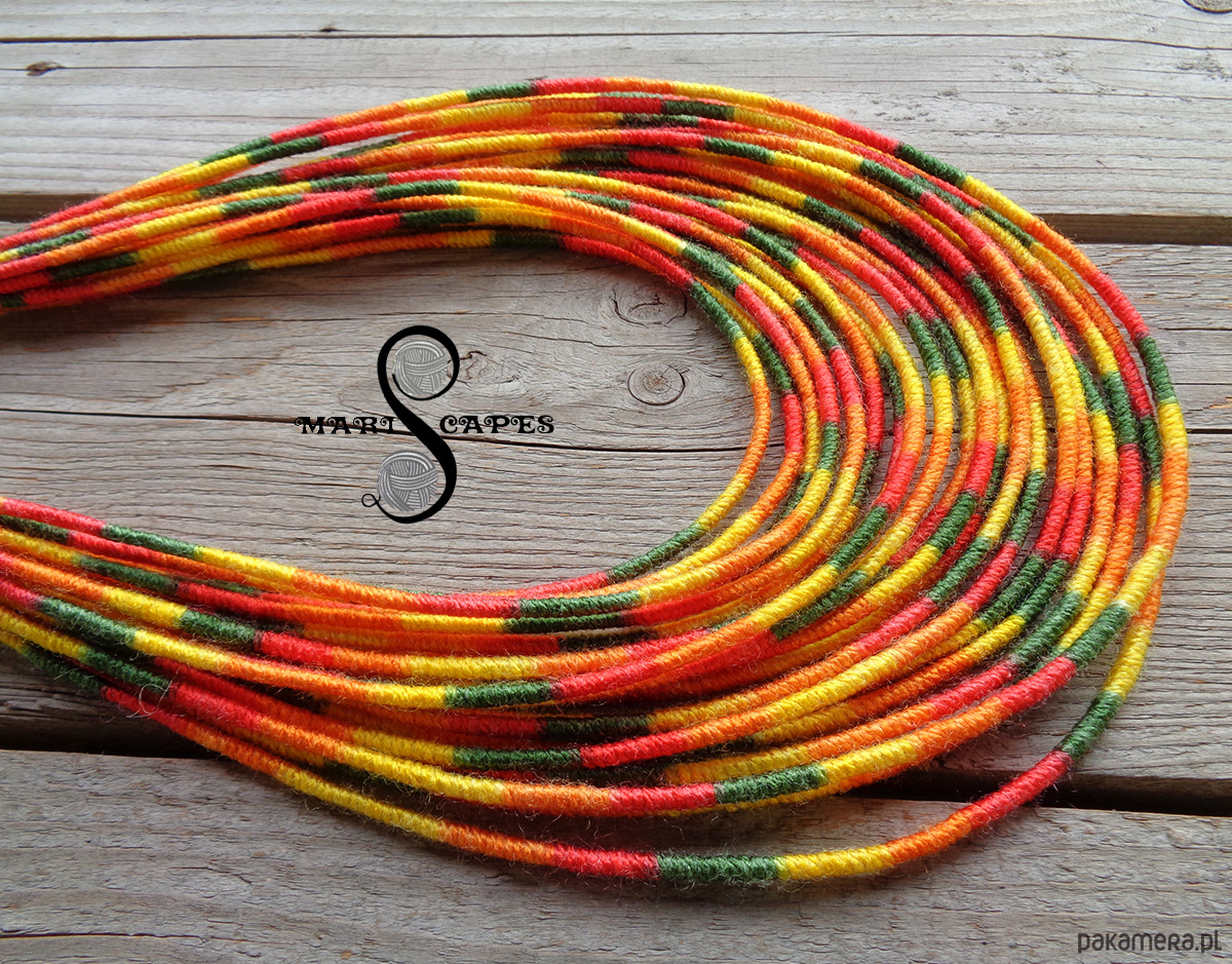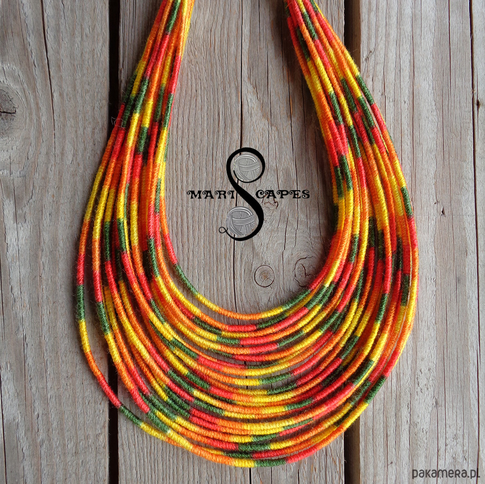 Unikalny naszyjnik w stylu etnicznym / afrykańskim z wymyślonej przeze mnie oryginalnej serii włóczkowych "Masajek". Długość ok. 45-65 cm Stworzony z połączenia wielu długich, nieco sztywnych sznurków, pieczołowicie ręcznie owiniętych miękką włóczką akrylową w słonecznych odcieniach. Wielowarstwowe kolorowe pasemka przywołują w pamięci masajskie ozdoby.