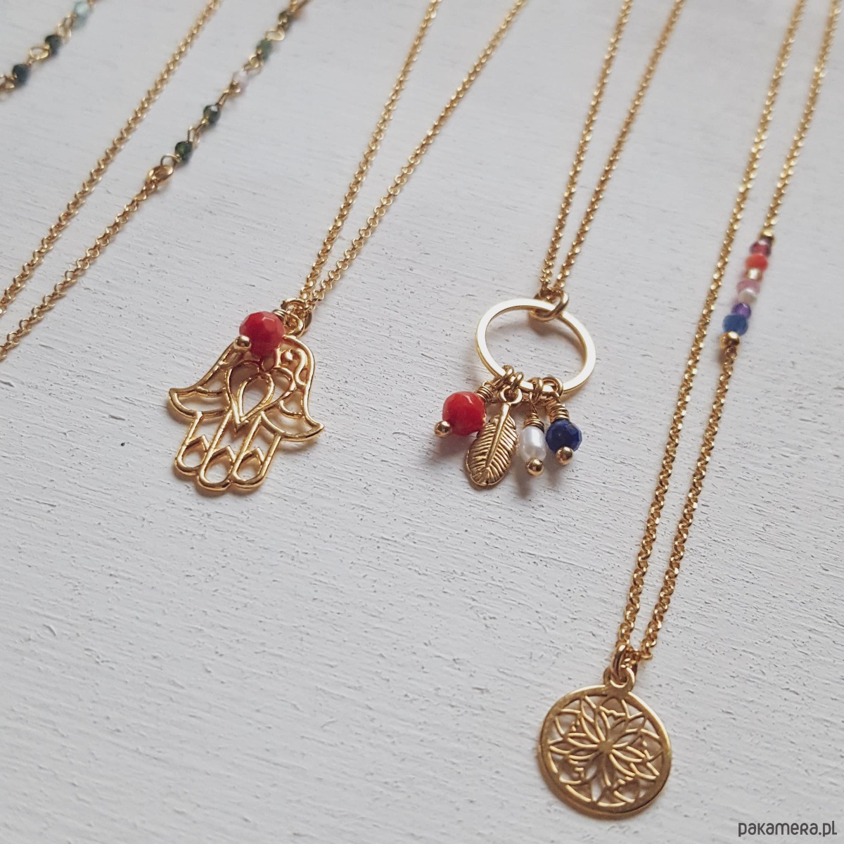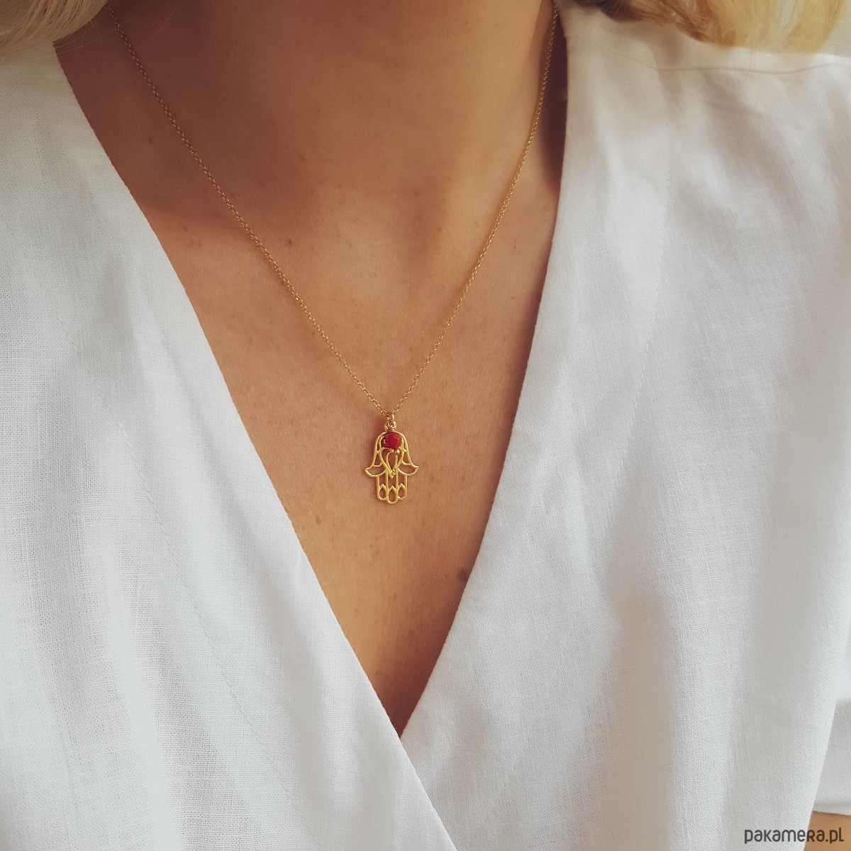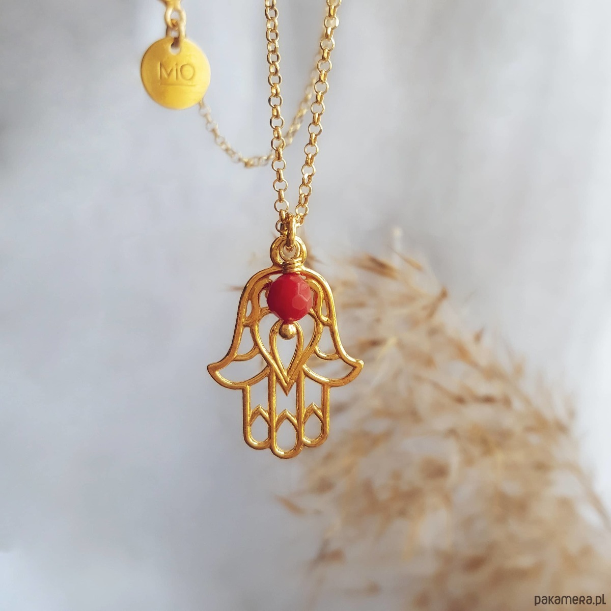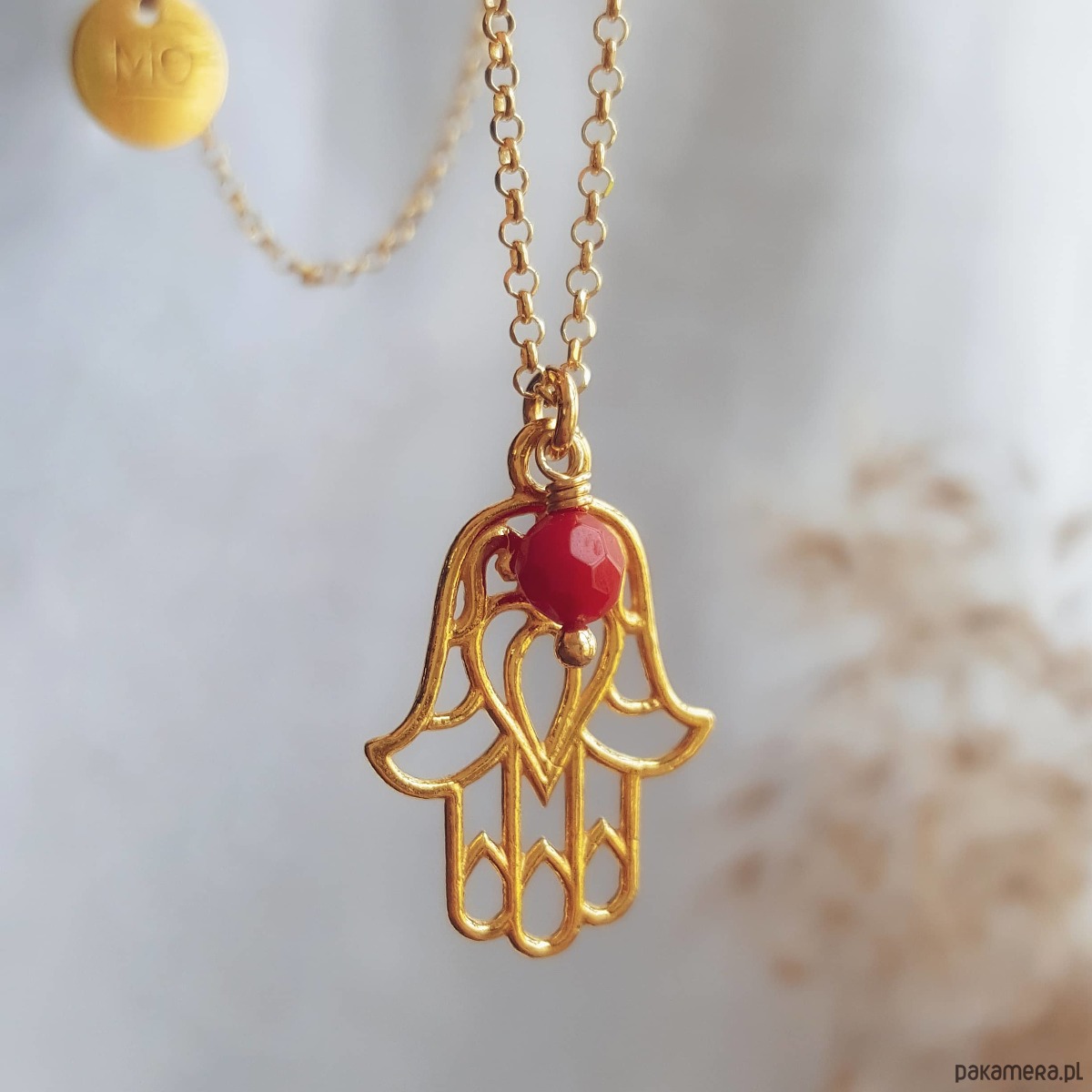 Naszyjnik hamsa z czerwonym koralem wykonany ze srebra pozłacanego 24 karatowym złotem. Głównym elementem ozdobnym jest ręka Fatimy lub Hamsa czyli otwarta dłoń, która jest symbolem chroniącym przed “złym okiem”. Dodatkowo umieściliśmy przy niej zawieszkę z fasetowanym czerwonym koralem. Koral również słynnie z właściwości ochronnych i zapewnia bezpieczeństwo przed złem. Naszyjnik zapina się na karabińczyk, przy którym znajduje się ozdobna blaszka z logo.