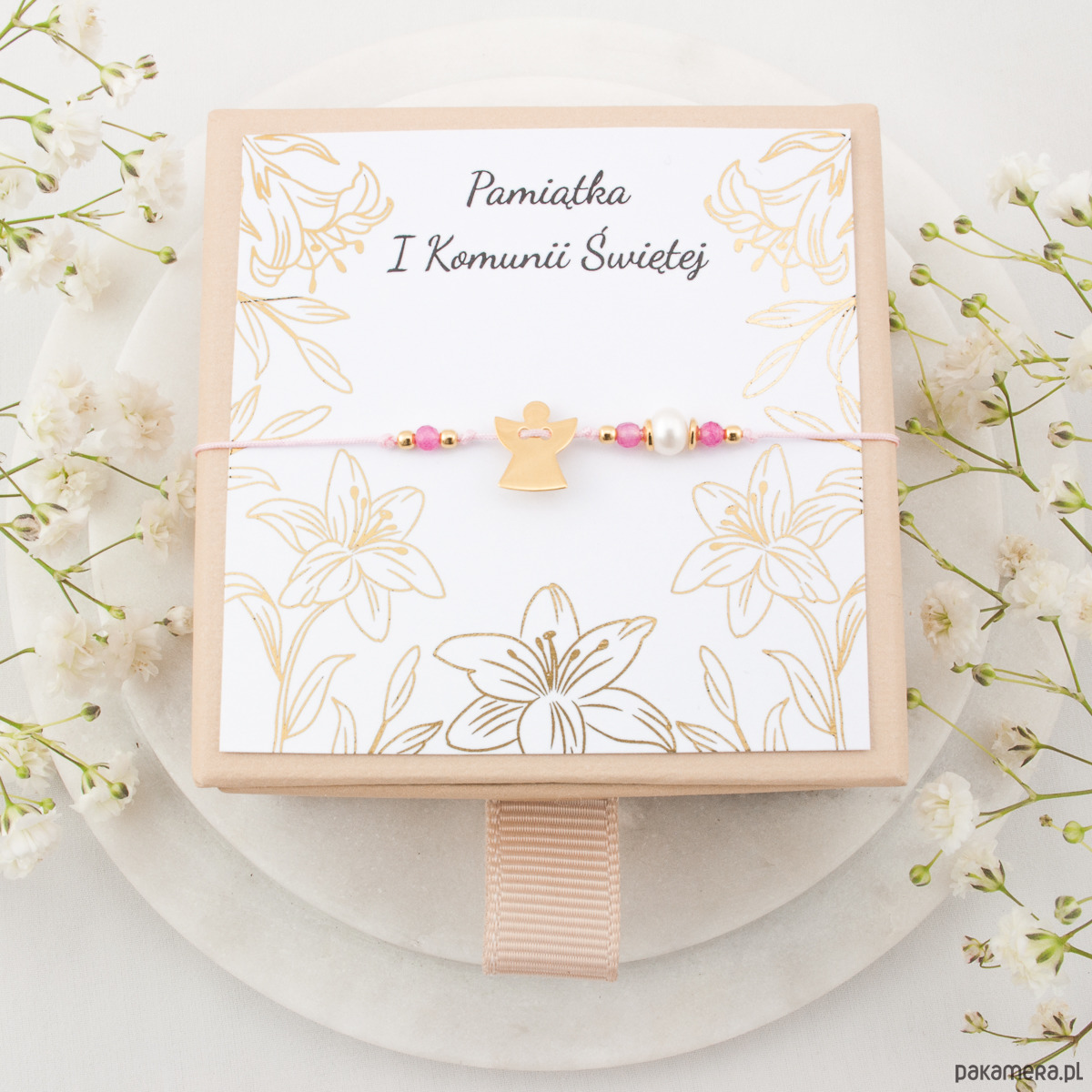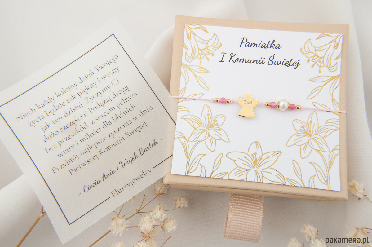 Pamiątka Pierwszej Komunii Świętej. Bransoletka dla dziewczynki wraz z osobistą dedykacją / życzeniami, zapakowana w eleganckie pudełko prezentowe.