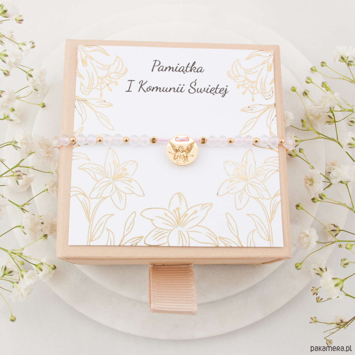 Pamiątka Pierwszej Komunii Świętej. Bransoletka dla dziewczynki wraz z osobistą dedykacją / życzeniami, zapakowana w eleganckie pudełko prezentowe.