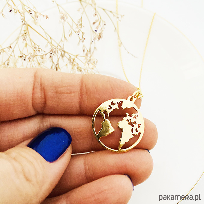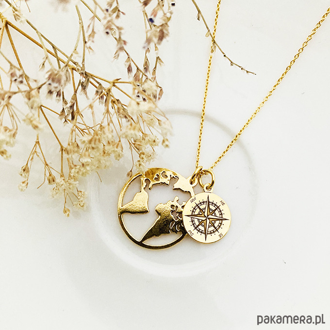 Naszyjnik przedstawia dwie zawieszki, z mapą świata oraz z kompasem, jest wykonany ze srebra próby 925 złocony 24 k złotem. Idealny jako prezent dla bliskiej osoby lubiącej podróże.