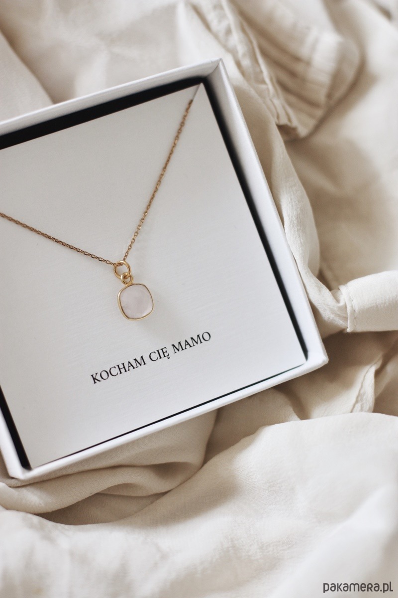 Naszyjnik z różowym kwarcem. Zapakowany w markowe pudełeczko z karteczką – “Kocham Cię Mamo”.