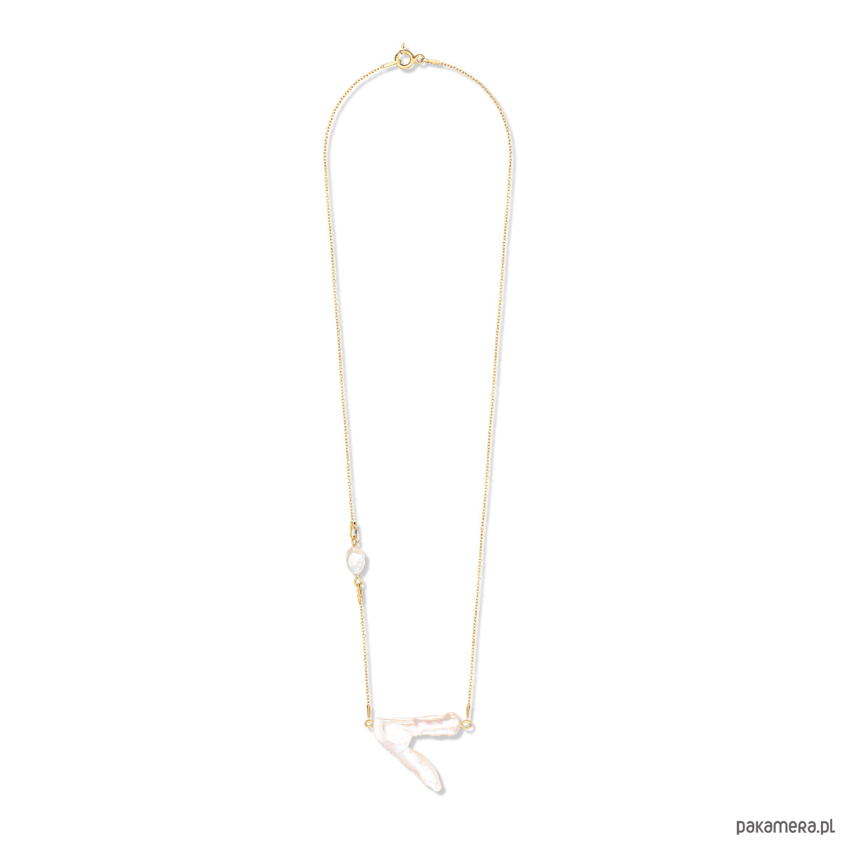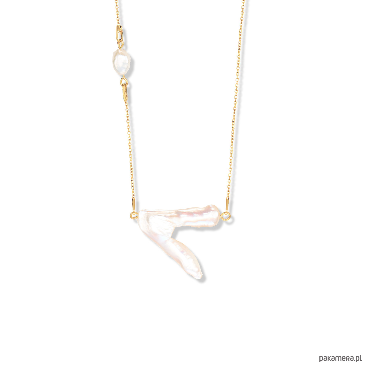 Naszyjnik z nieregularnymi perłami hodowlanymi. Całość wykonana ze srebra próby 925, złocone 24-karatowym złotem. Biżuterię wykonujemy ręcznie, dlatego wielkość, kształt oraz kolor pereł może nieznacznie różnić się od tego na zdjęciu.