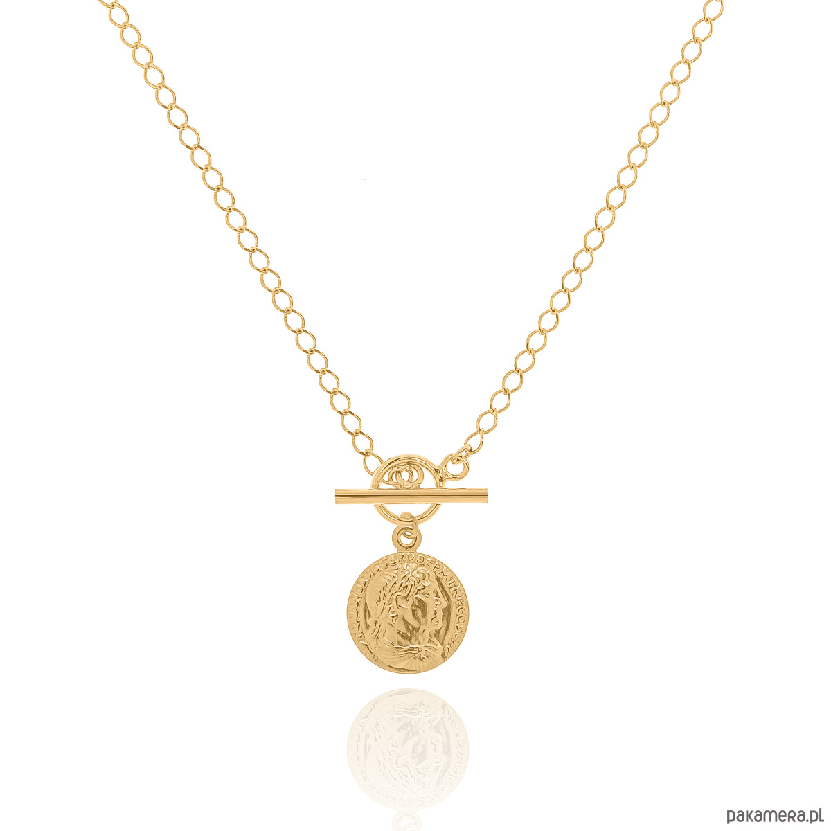Naszyjnik rombo srebrny pozłacany z ozdobnym zapięciem toggle i dużą monetą. Całość wykonana ze srebra 925 pokrytego 24 karatowym żółtym złotem.