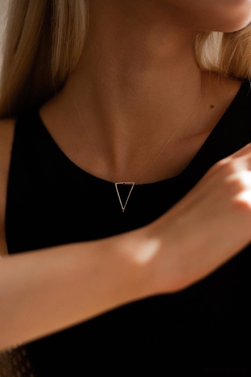– srebrny wisior TRÓJKĄT jest zawieszony na transparentnej żyłce; żyłka ma wytrzymałość łańcuszka