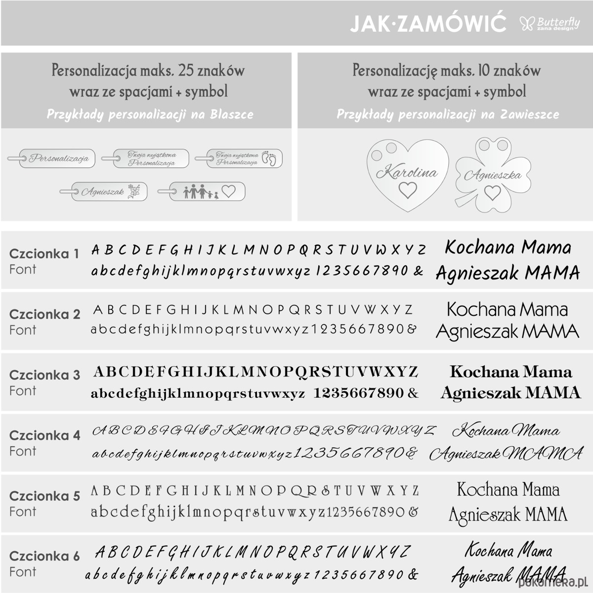 Podczas składania zamówienia w rubryce„ wiadomość dla sprzedającego” czcionki, tekst / inicjały / datę / numer symbolu.