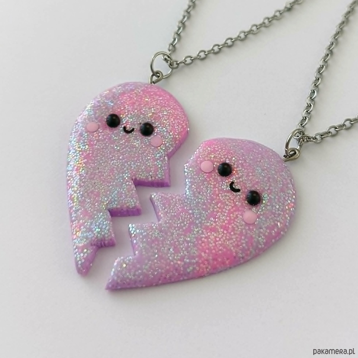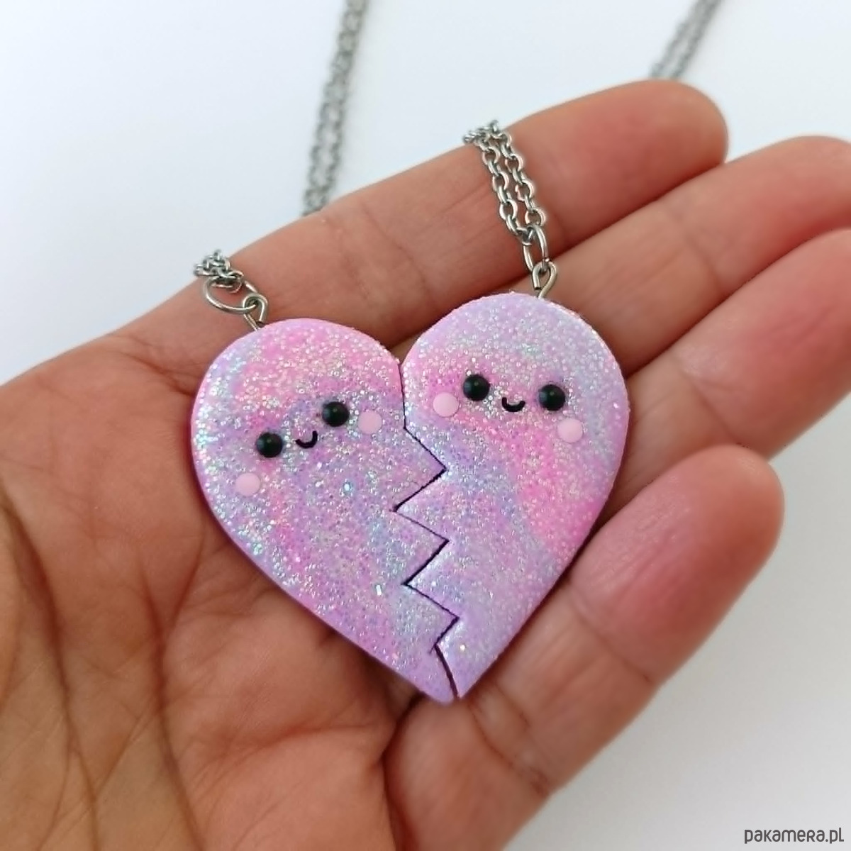 Ten zestaw BFF składa się z dwóch dopasowanych połówek pastelowego brokatowego serca z buźkami. Delikatne odcienie różu i lawendy oraz subtelny połysk sprawiają, że naszyjnik jest wyjątkowy i pełen uroku.