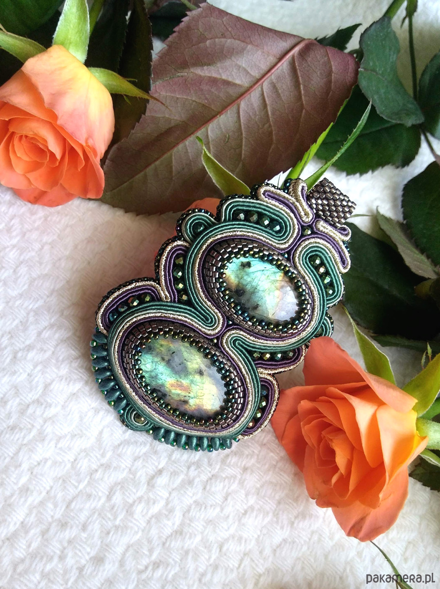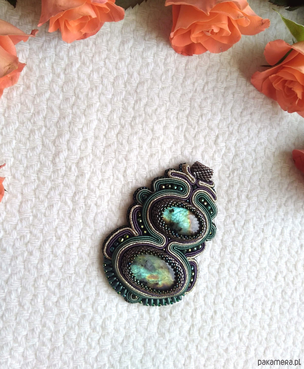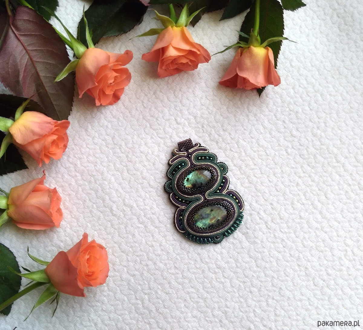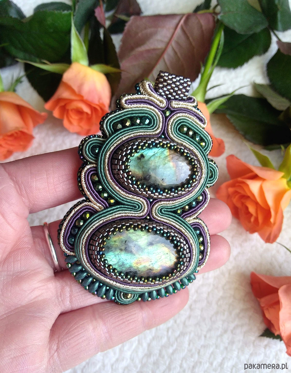 Niezwykły, unikatowy wisior z labradorytami wykonany w bardzo pracochłonnej technice haftu sutasz.
