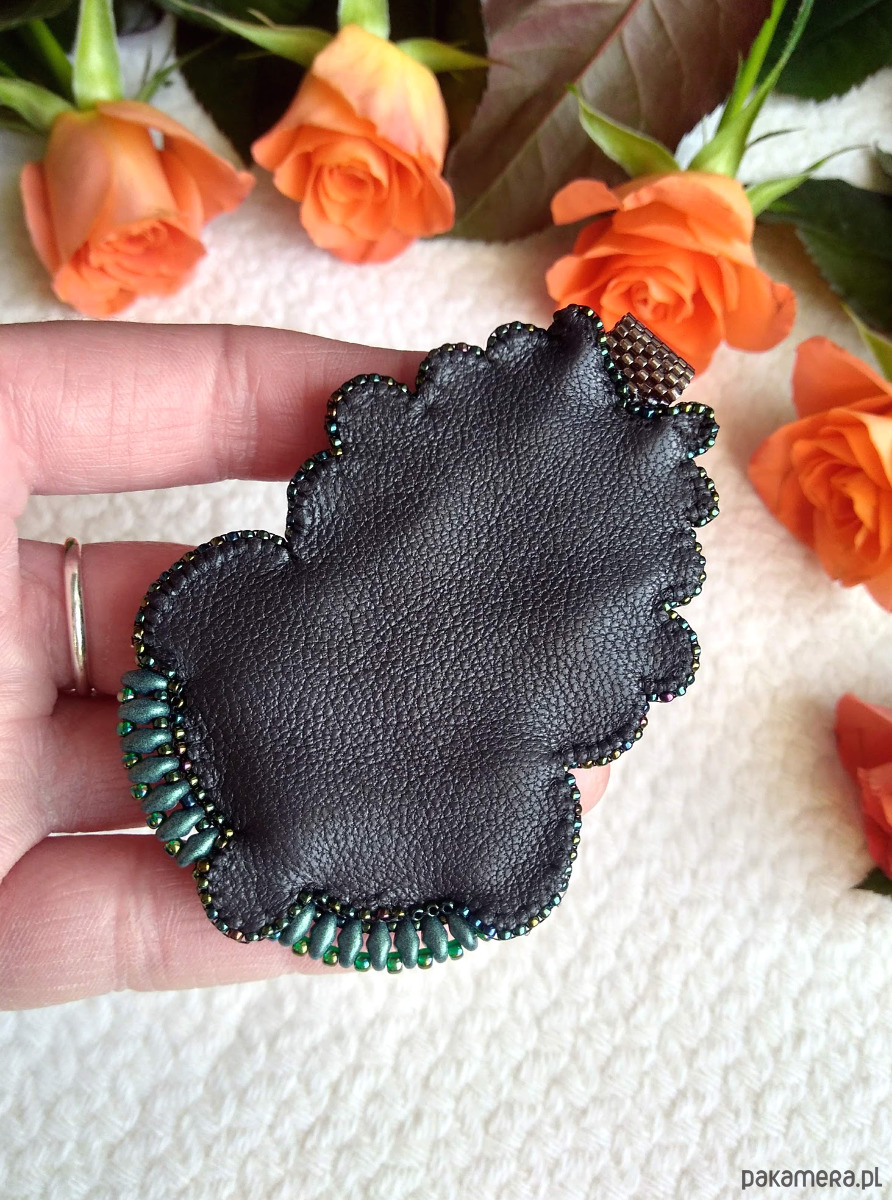 Labradoryty skrzą się różnymi barwami - seledyn, złoto i bakłażan zamknięte w chłodnych, gładkich bryłkach ??? Nadałam mu imię "Cordibus", łacińskie słowo oznaczające "serduszka". Labradorytom towarzyszą fasetowane kuleczki hematytu mieniące się złotem i zielenią. Tył wykończyłam skórą naturalną z recyklingu. Amulet można zawiesić na rzemieniu lub sznureczku dzięki krawatce, którą uszyłam ze szklanych japońskich koralików Miyuki.