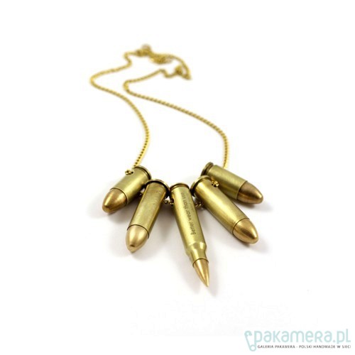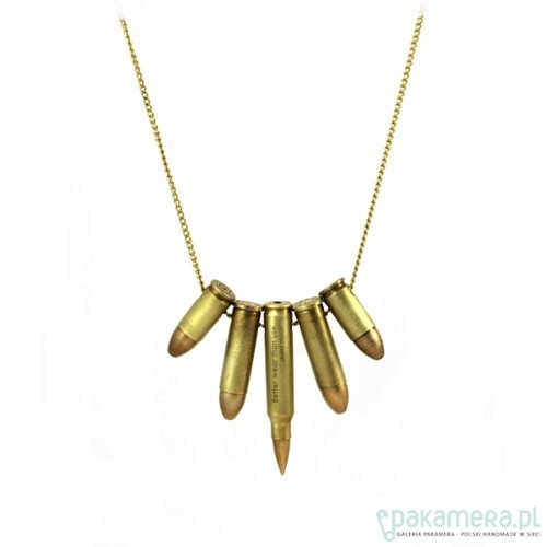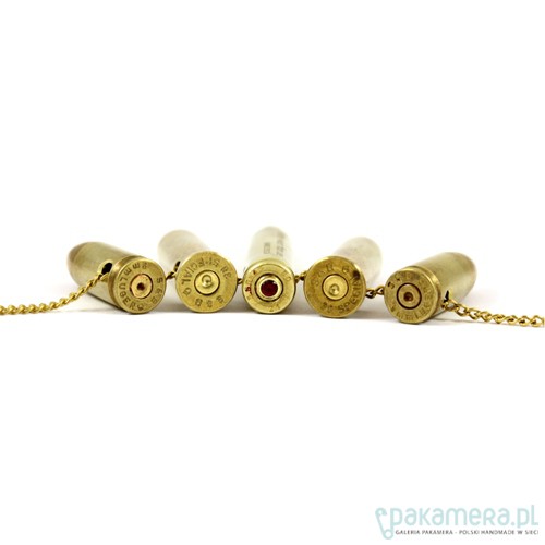 Oryginalny naszyjnik wykonany z pięciu prawdziwych nabojów. Na szczycie łuski środkowego naboju, ręcznie oprawiona cyrkonia Swarovskiego 3mm, z boku wygrawerowany tytuł kolekcji " Better Wear Than Use" oraz marka Unikke Design. Wisior zawieszony na mosiężnym łańcuszku długości około 50cm. Długość nabojów: mały 2,9cm, średni 3,9cm, środkowy 5,7cm.