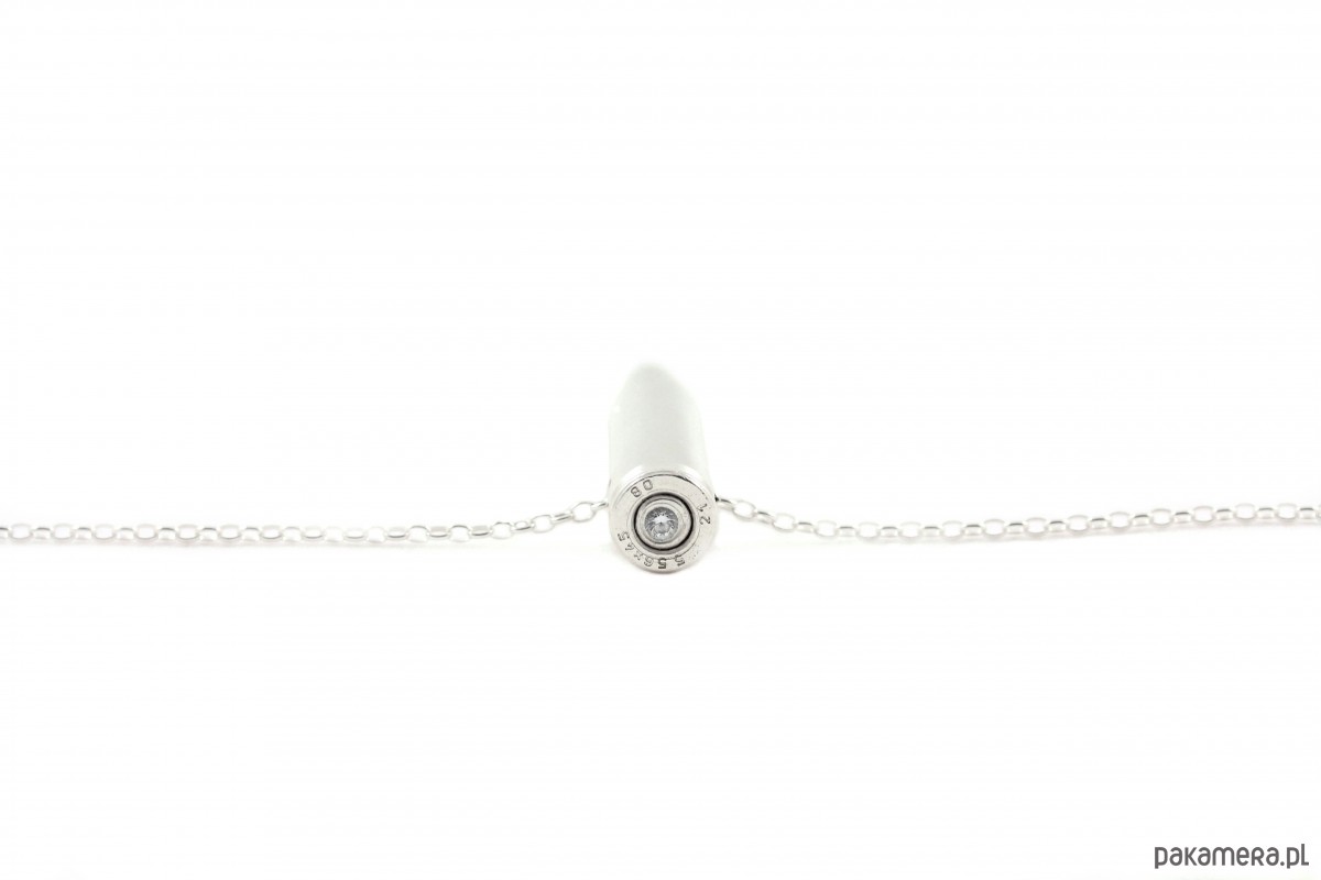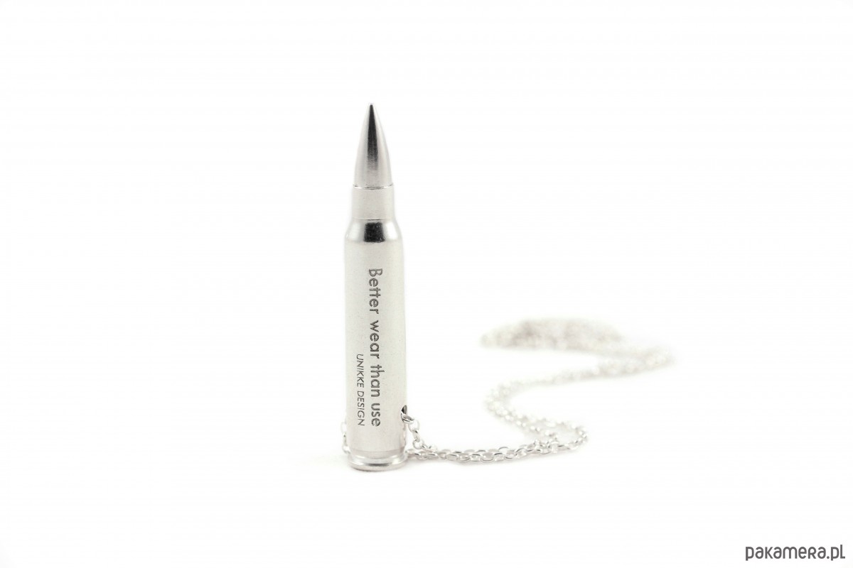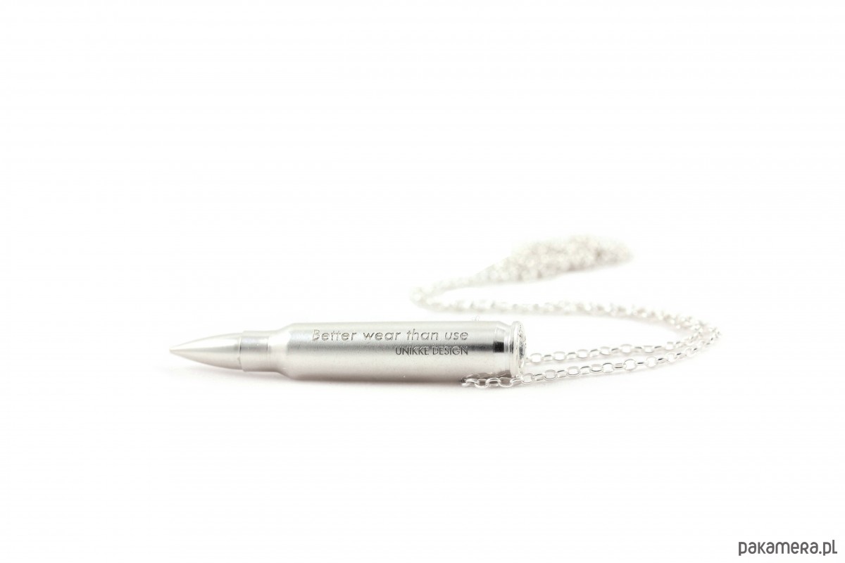 Efektowny naszyjnik wykonany z prawdziwego naboju. Na szczycie łuski ręcznie oprawiona biała cyrkonia, z boku wygrawerowany tytuł kolekcji " Better Wear Than Use" oraz marka Unikke Design. Wisior zawieszony na srebrnym (próba 925) łańcuszku. Nabój grubo srebrzony. Długość łańcuszka 80 cm. Długość naboju 5,7 cm.