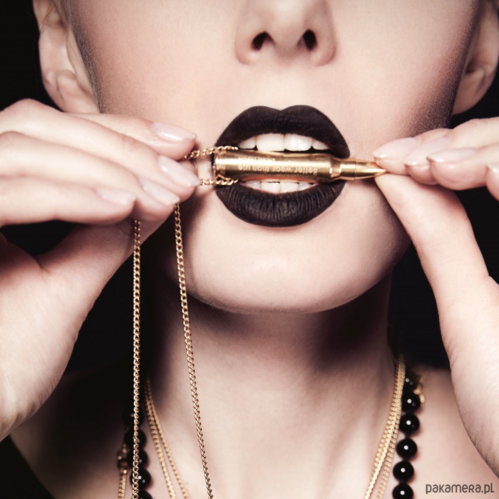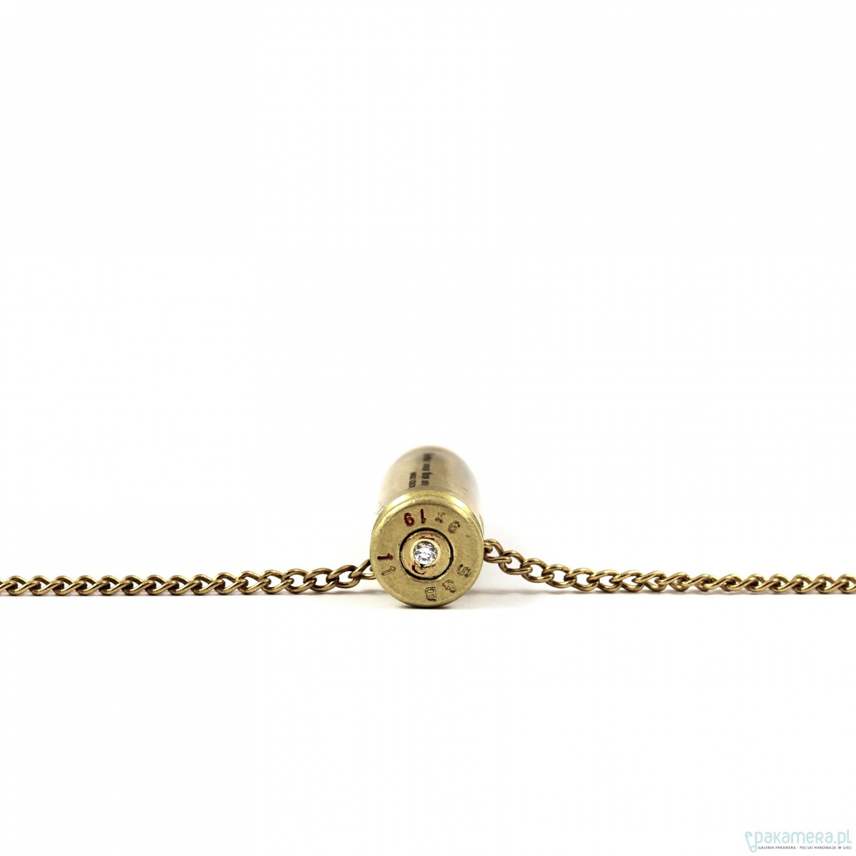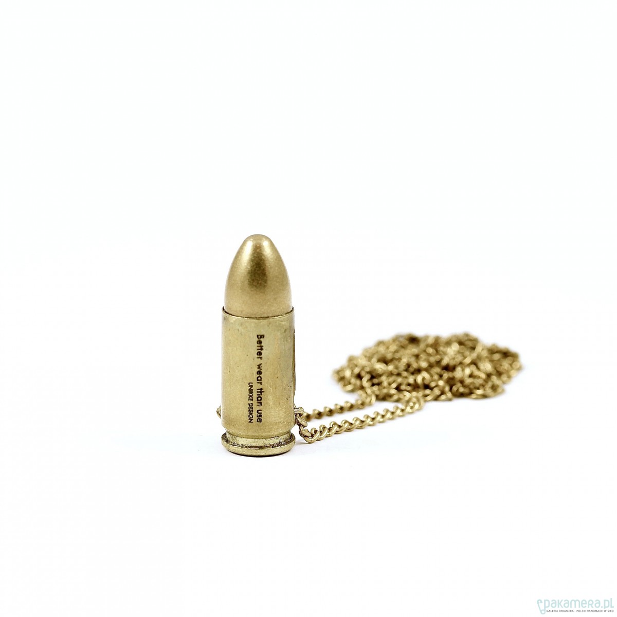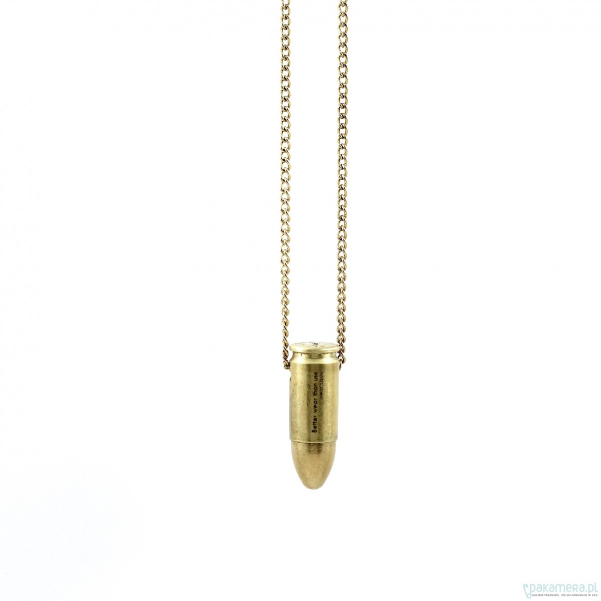 Naszyjnik z kolekcji "Better Wear Than Use" wykonany z prawdziwego naboju. Na szczycie łuski ręcznie oprawiona biała cyrkonia 2mm, z boku wygrawerowany tytuł kolekcji oraz marka Unikke Design. Mosiężny łańcuszek długości 80cm. Możliwość wyboru innego koloru cyrkonii: szafirowa, szmaragdowa, rubinowa, czarna - proszę o informację w komentarzu do zamówienia. Długość naboju 2,9 cm.