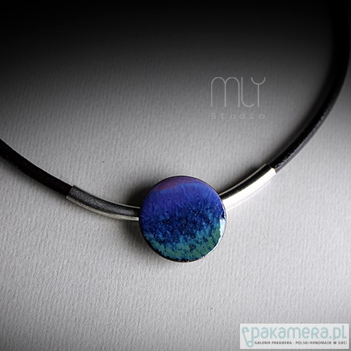 Efektowny ceramiczny wisior, ręcznie wykonany z mocno spieczonej czekoladowobrązowej gliny kamionkowej, jednostronnie szkliwiony mieszanką błękitnych i fioletowych szkliw z efektem plamek , tył surowy,ciemnobrązowy, zawieszony na grubym rzemieniu jubilerskim z zapięciem w kolorze srebrnym. Średnica elementu ceramicznego około 27mm, obwód linki ok 44cm (plus 10cm łańcuszka regulacyjnego). Polecam. Termin realizacji zamówienia to 1-2 dni.