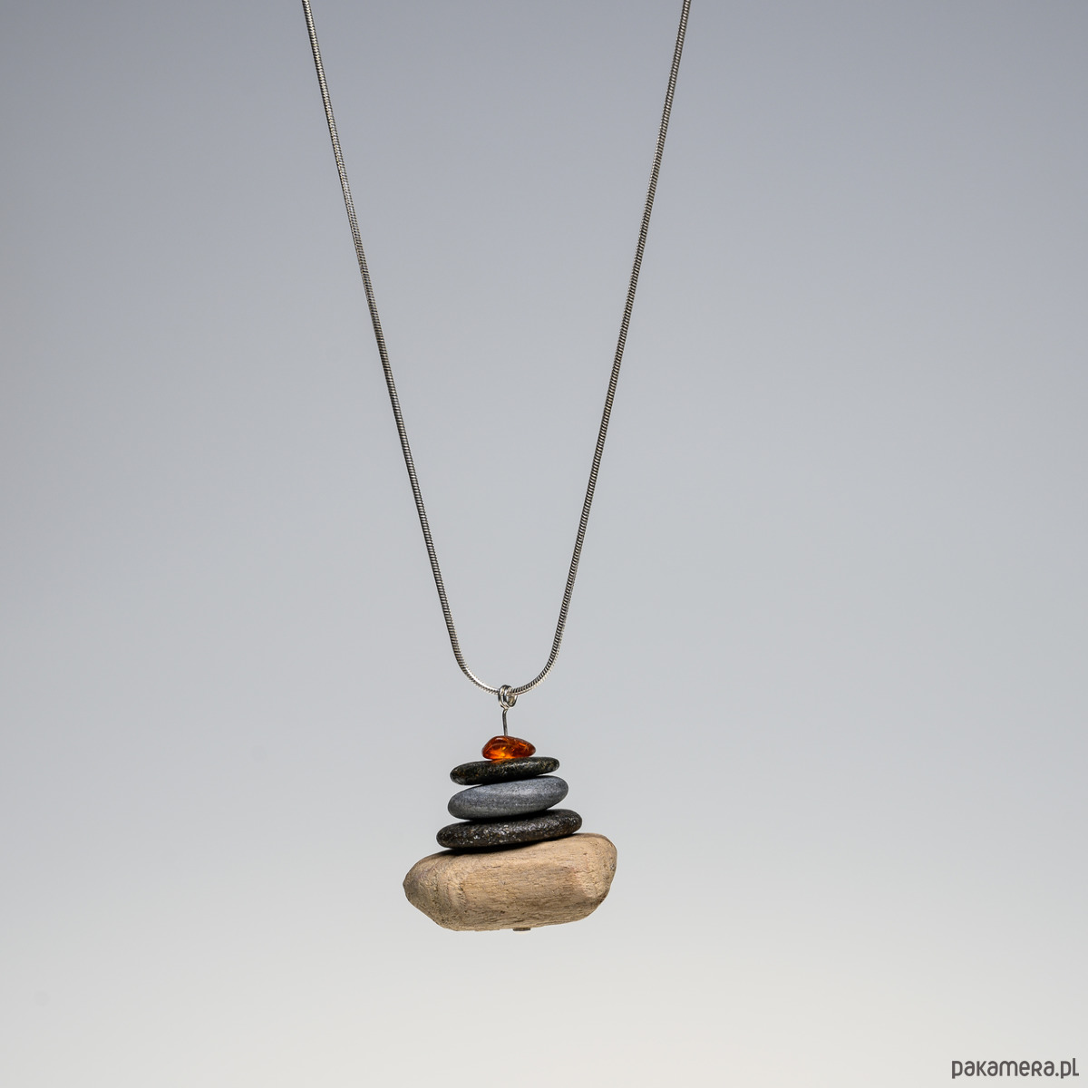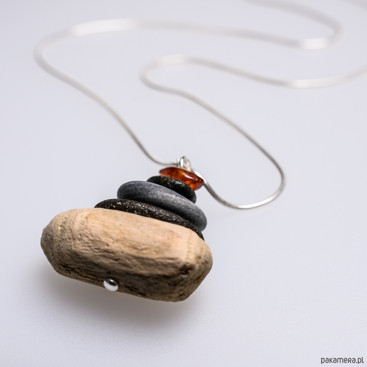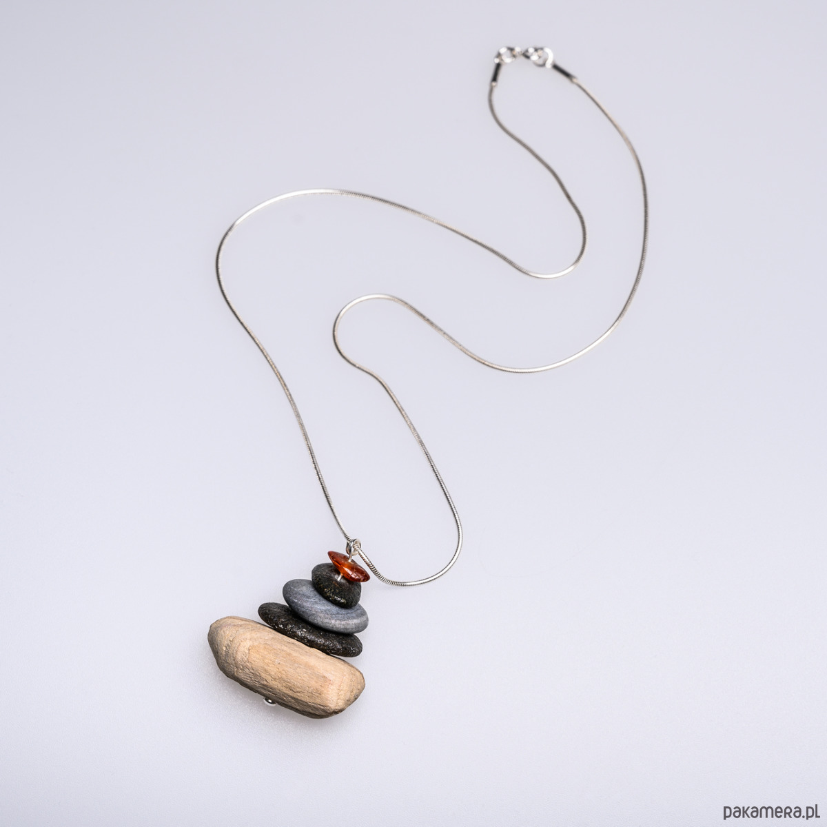 Drewno, kamyki i bursztyn znalezione nad Bałtykiem, nawleczone na srebrny łańcuszek.