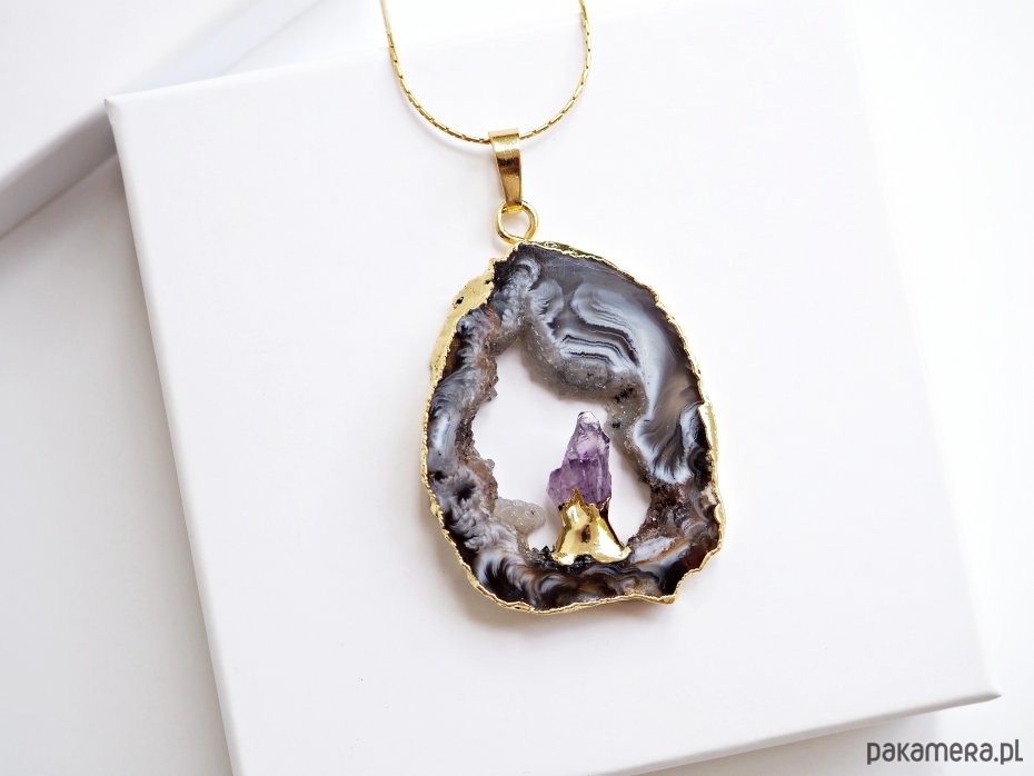 Naszyjnik wykonany z druzy agatu o nieregularnych kształtach z malutkim ametystem wewnątrz. Łańcuszek wykonany z 14k pozłacanego srebra 925.