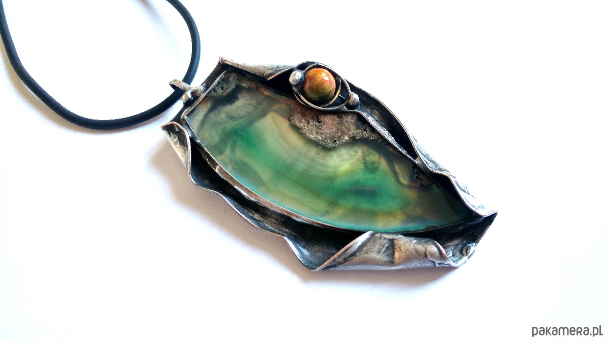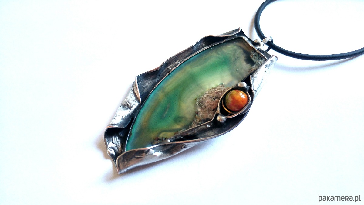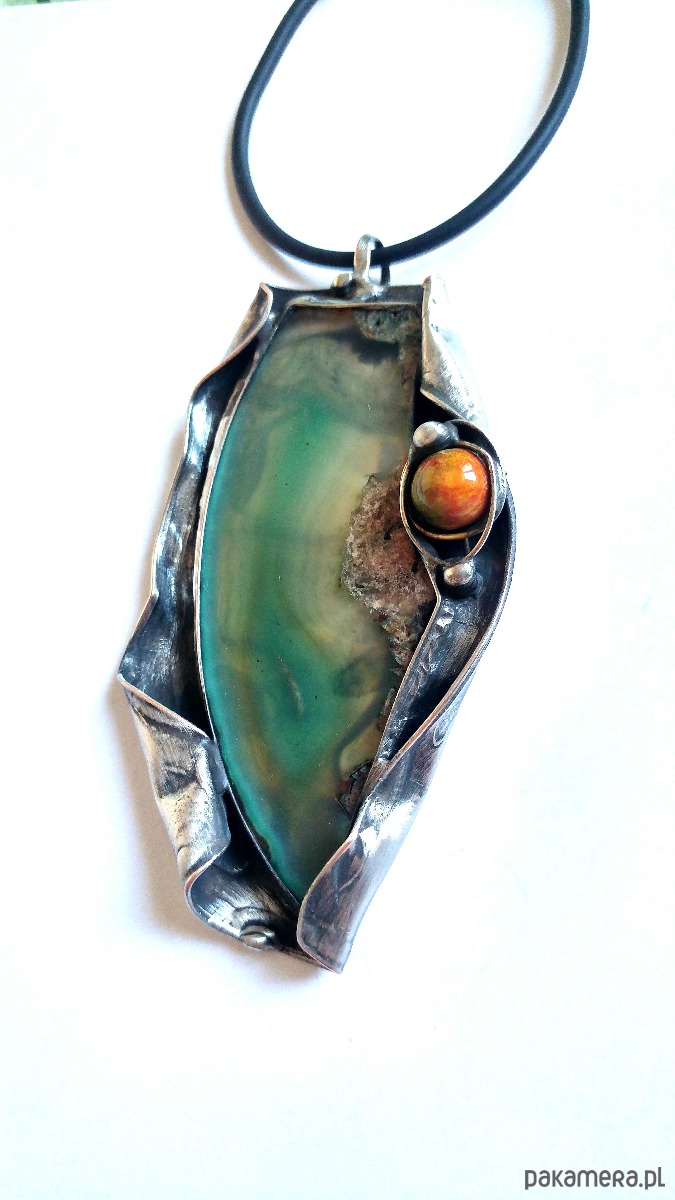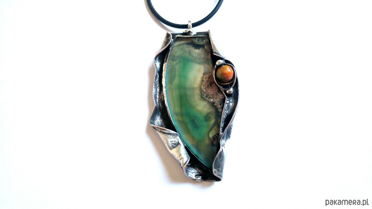 Wisiorek wykonany z miedzi, cyny, jaspisu i agatu. Wymiary ok. 9 na 5 cm. Zawieszony na czarnej lince kauczukowej o długości ok. 47 cm.