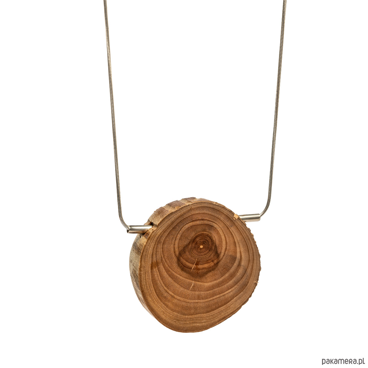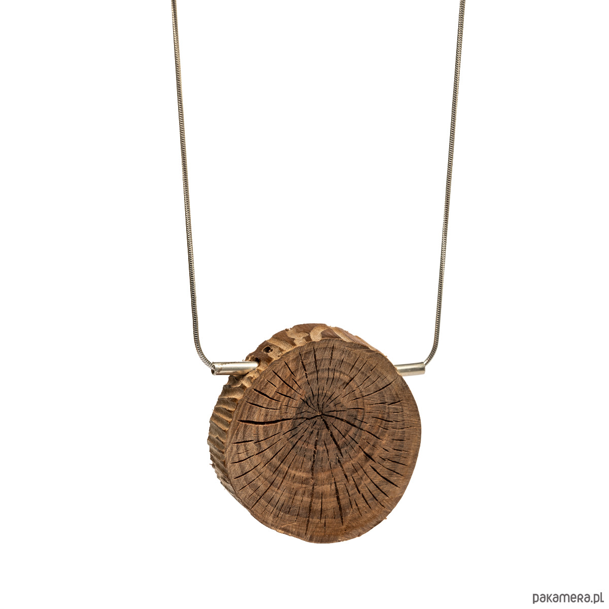 Jednostronnie polerowane drewno jabłoni, nawleczone na srebrną rurkę i srebrny łańcuszek.