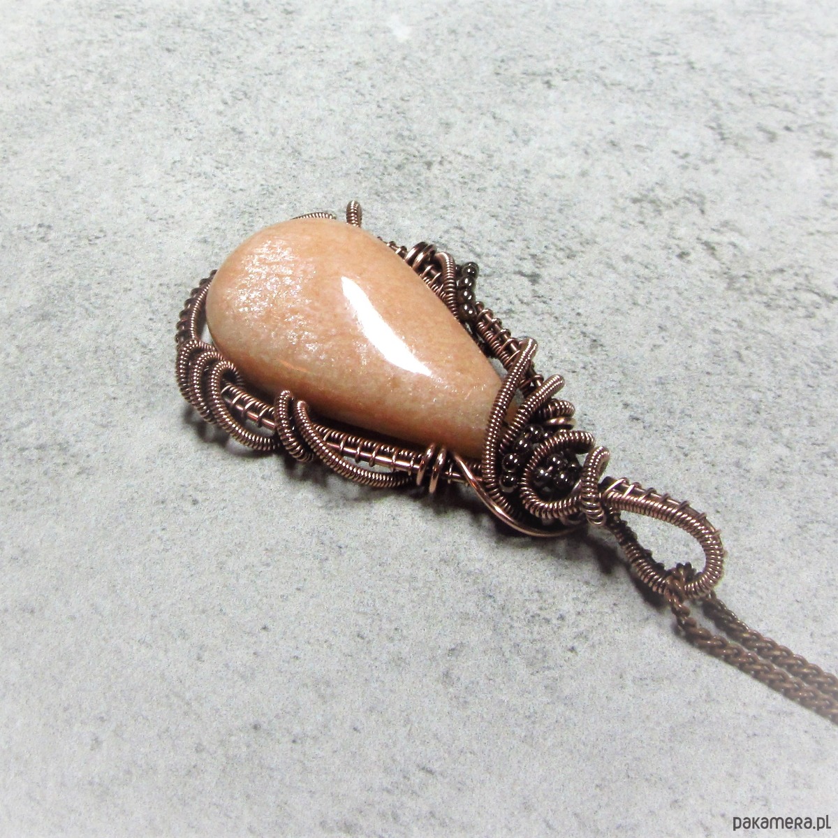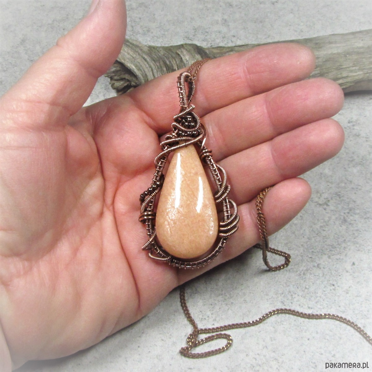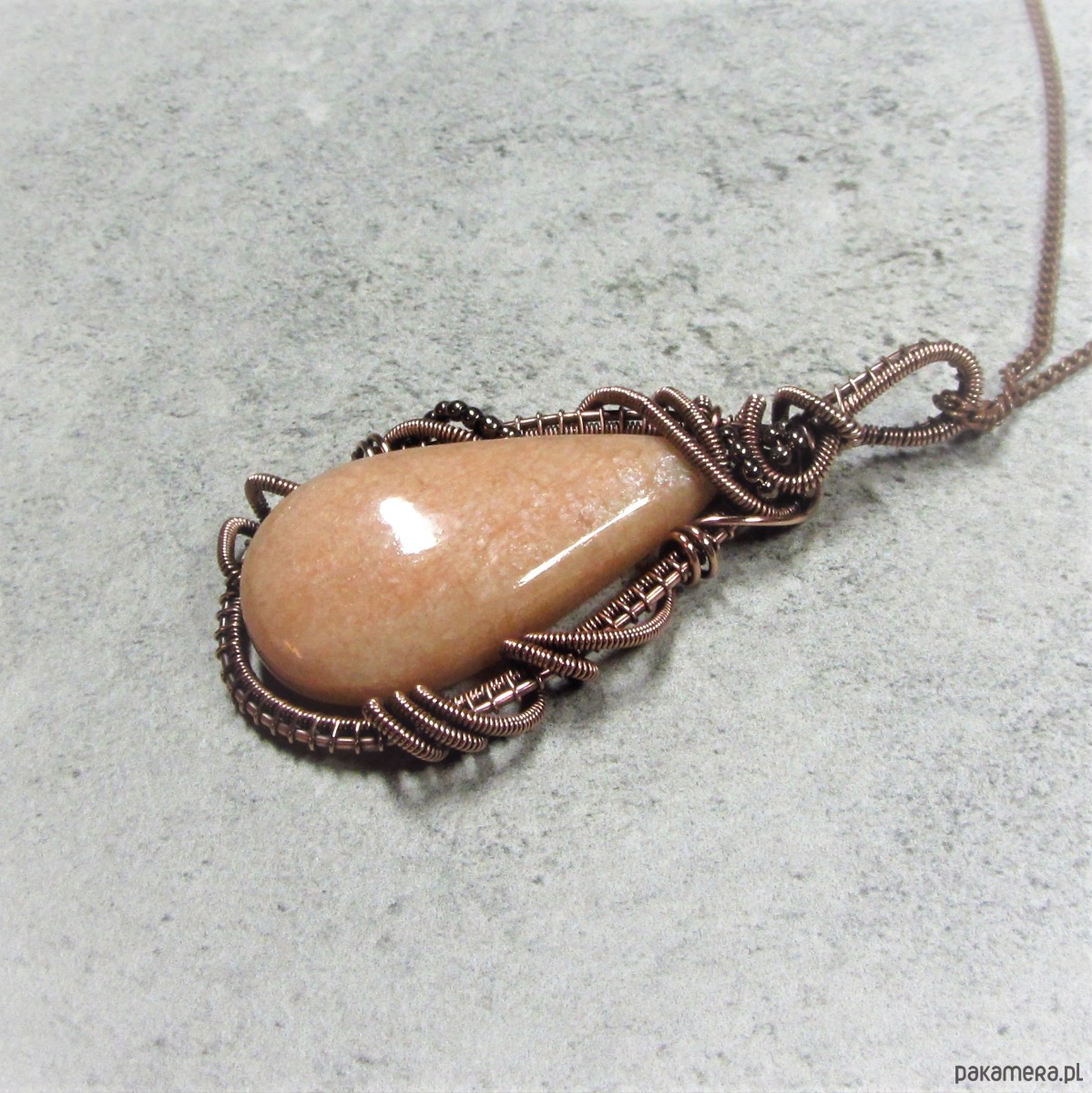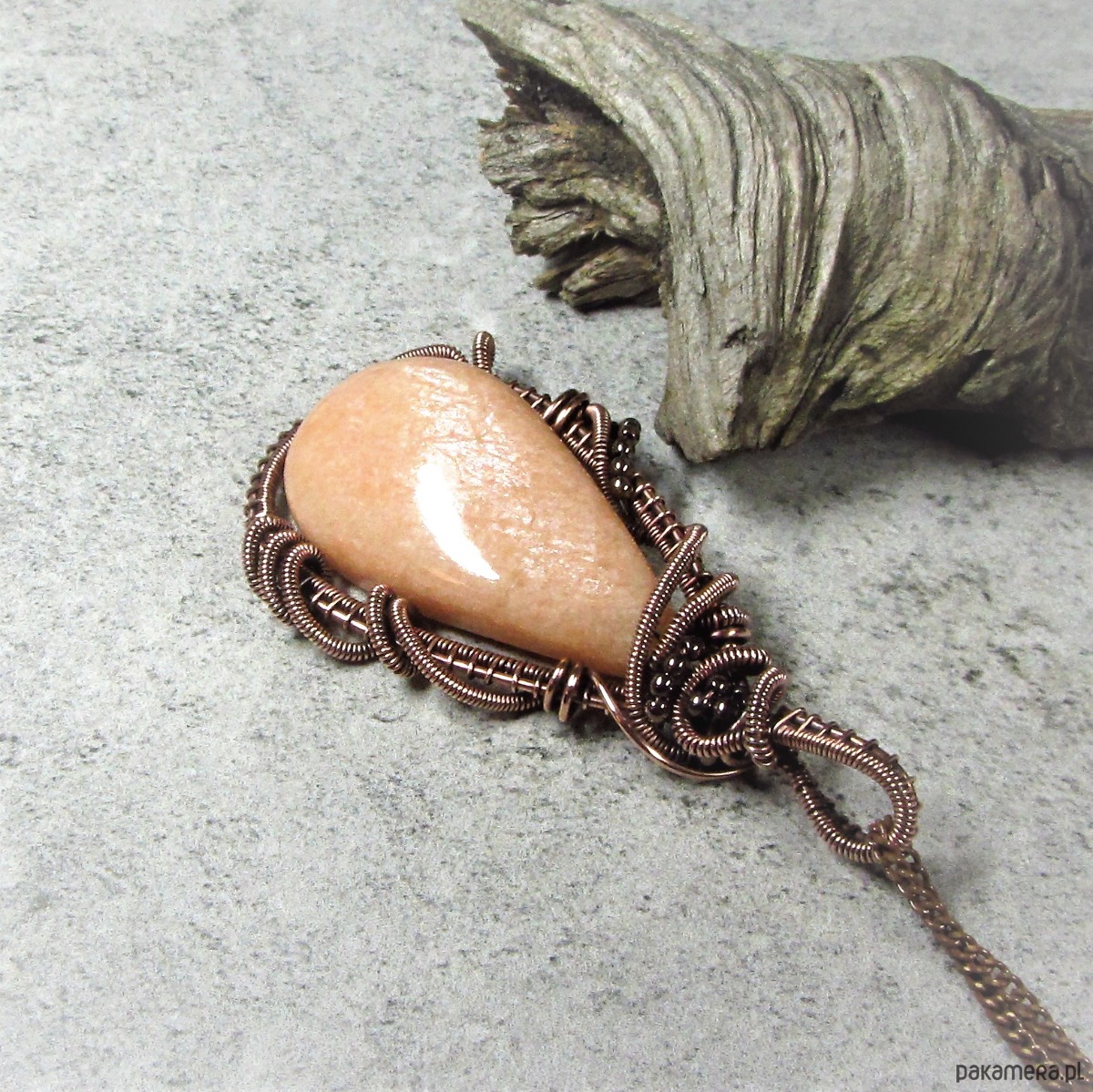 Naszyjnik wykonany z kaboszona naturalnego amazonitu którego powierzchnia pięknie połyskuje perłowymi refleksami. Kamień ma kolor jasno brzoskwiniowy pokryty satynowym blaskiem. Całość wykonana w miedzi pracochłonną metodą wire wrappingu, następnie oksydowana i wypolerowana dla uzyskania efektu szlachetnego postarzenia. Wymiary naszyjnika 71x37 mm, wisiorek z łańcuszkiem długości 48-50 cm.