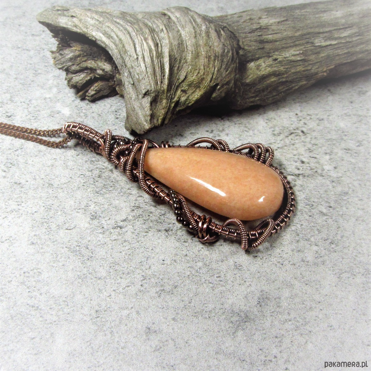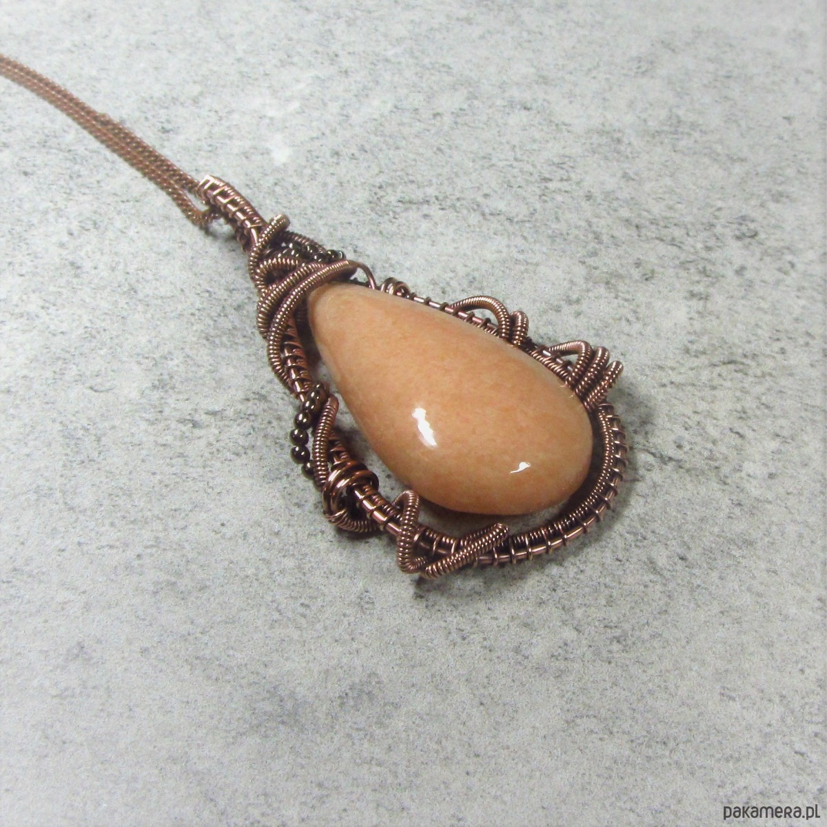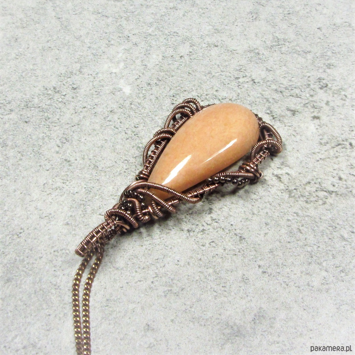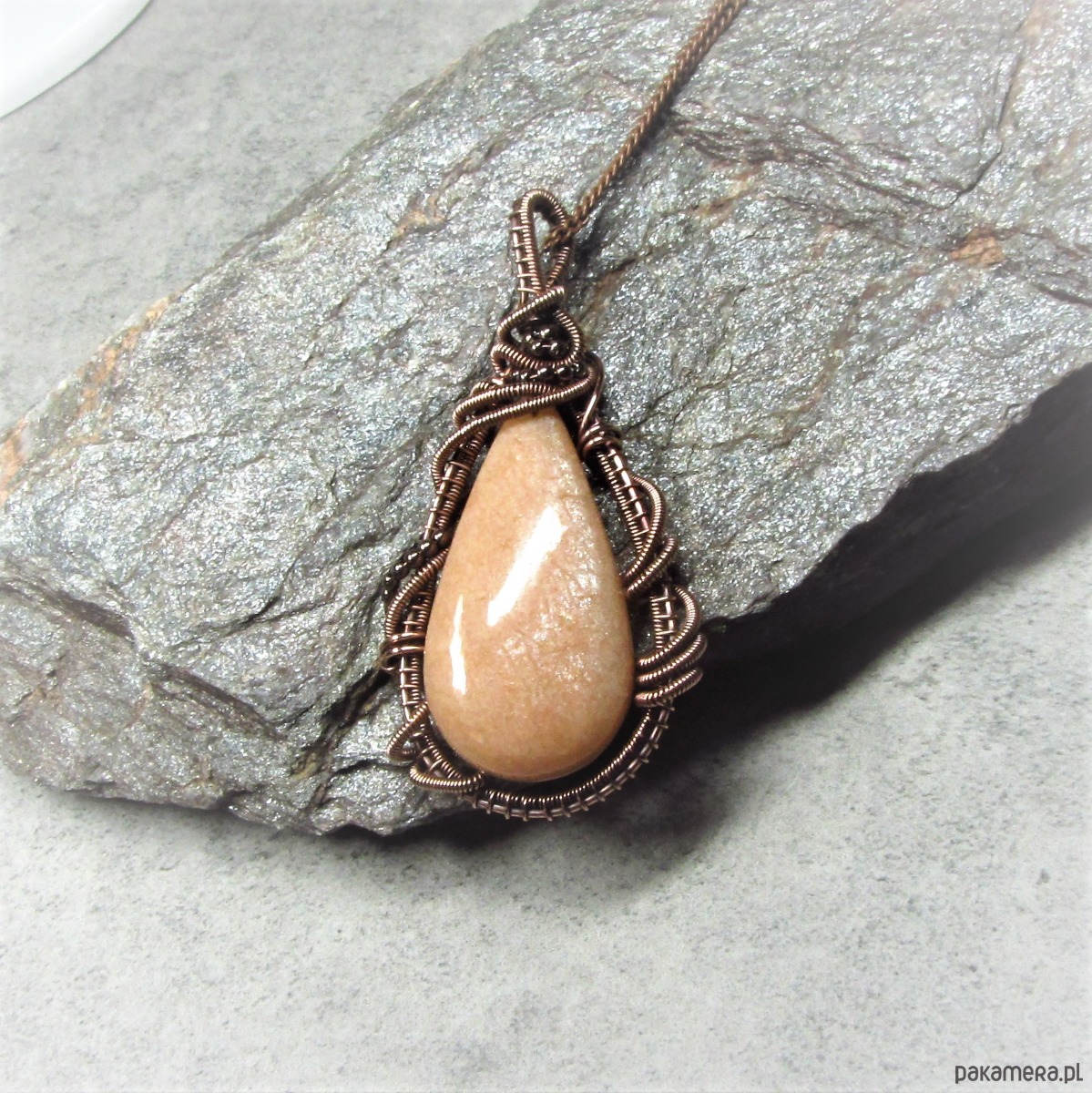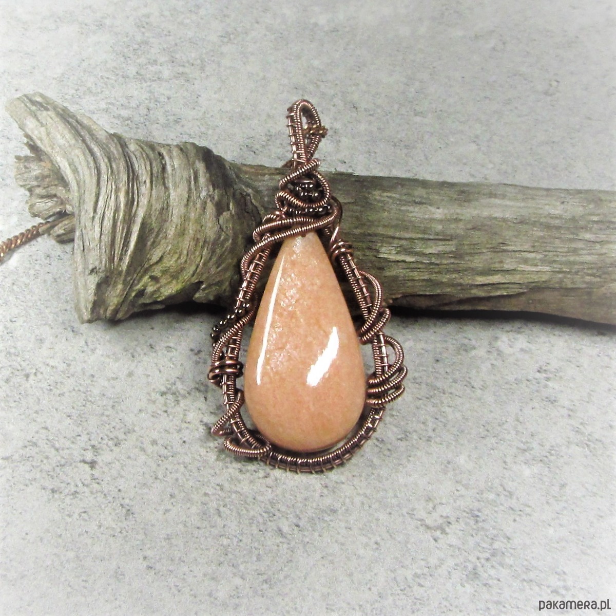 Naszyjnik wykonany z kaboszona naturalnego amazonitu którego powierzchnia pięknie połyskuje perłowymi refleksami. Kamień ma kolor jasno brzoskwiniowy pokryty satynowym blaskiem. Całość wykonana w miedzi pracochłonną metodą wire wrappingu, następnie oksydowana i wypolerowana dla uzyskania efektu szlachetnego postarzenia. Wymiary naszyjnika 71x37 mm, wisiorek z łańcuszkiem długości 48-50 cm.