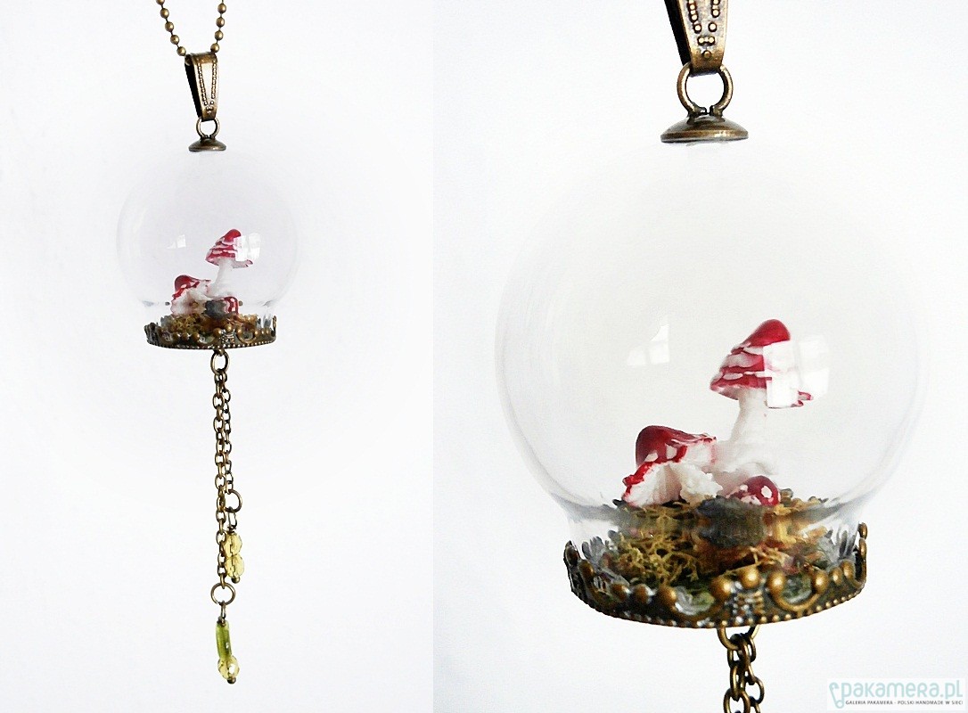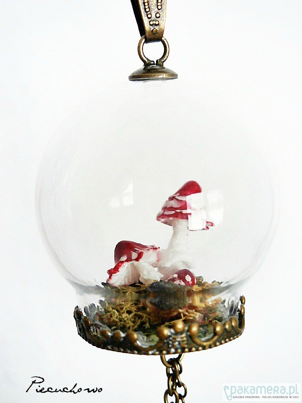 Witam serdecznie. przedmiotem sprzedaży jest unikalny i jedyny naszyjnik, który skrywa kawałek Twojej bajki. Zaczarowanego lasu i muchomorków. Muchomorki wykonane zostały z masy fimo- w środku trawka, suche listki,chrobotnik. Wszystko pod szklana kopułą średnicy ok 3 cm. Łańcuszek kulkowy drobny w kolorze starego złota. Zapraszam ciepło Piecyk