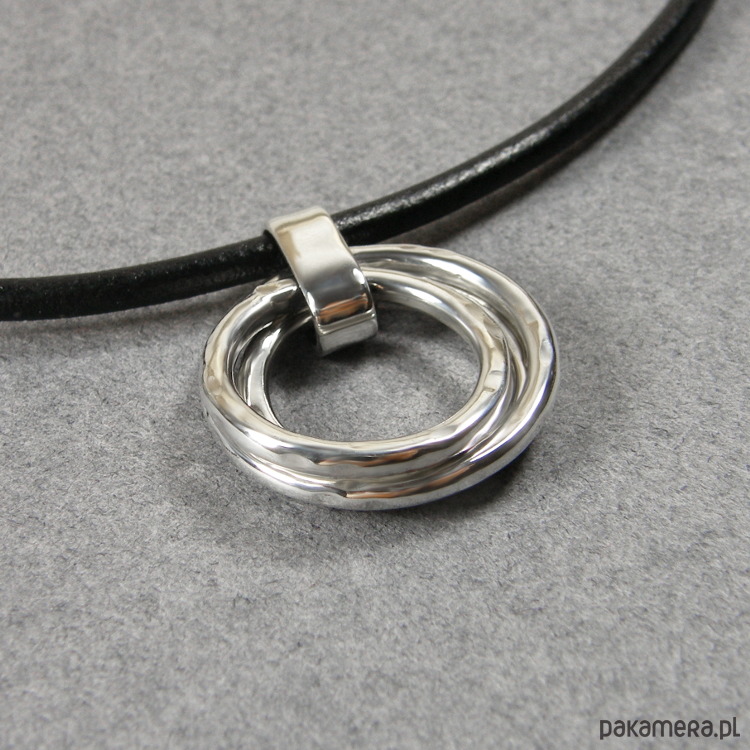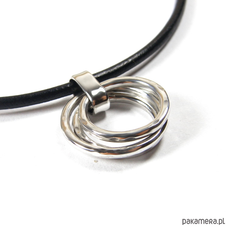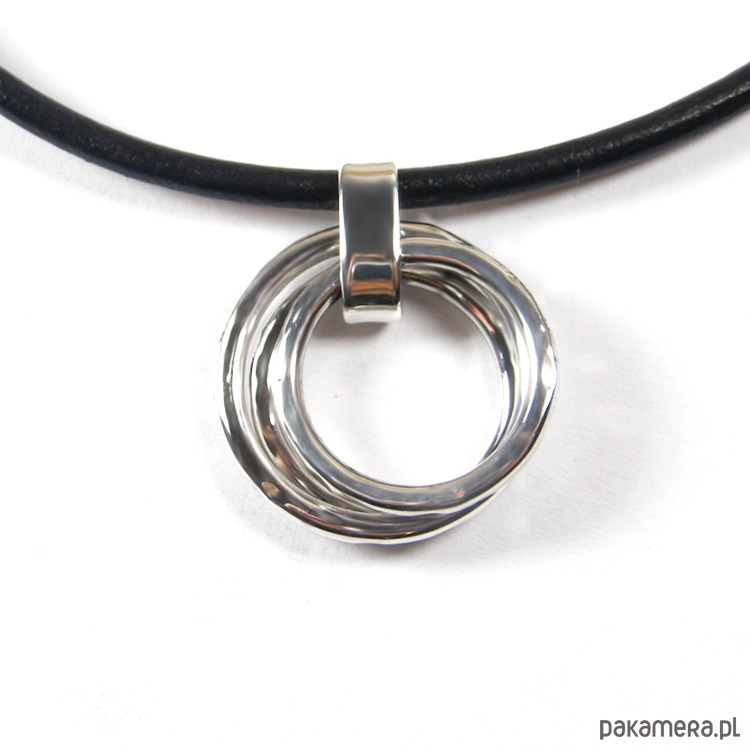 Wykonany ze srebra próby 925. Wypolerowany na wysoki połysk.Kółka delikatnie młotkowane. Rzemień ze srebrnym zapięciem w komplecie.