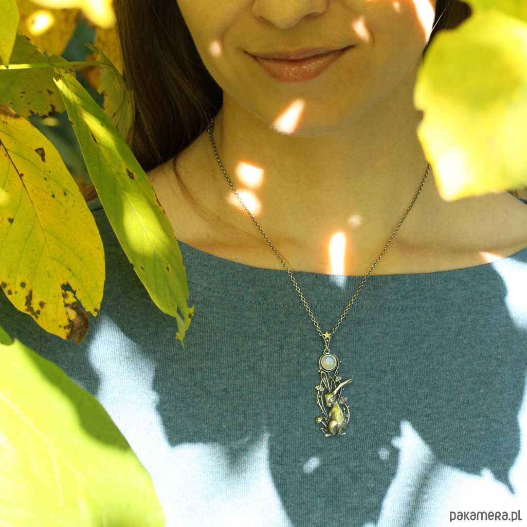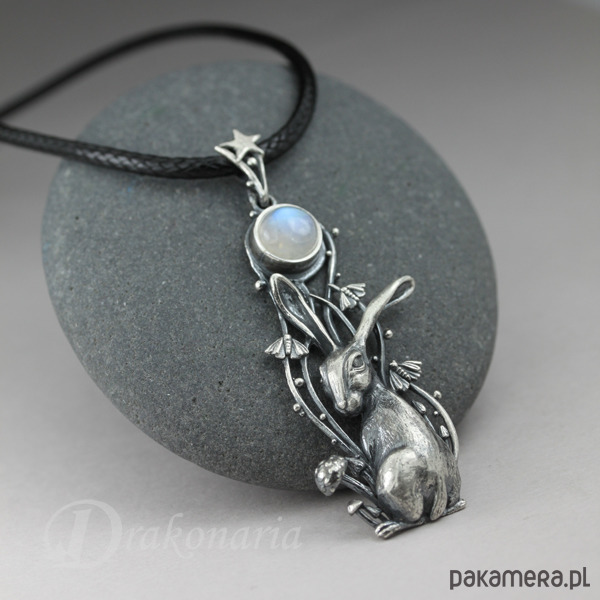 Wisiorek przedstawia maleńkiego zająca i Księżyc w pełni - symbol obecny w wielu kulturach, praktycznie na całym świecie - od Chin poczynając, poprzez Indie, Amerykę Południową i Środkową, na Wyspach Brytyjskich i wielu krajach Europy kończąc. Księżycowy zając kojarzony jest z siłami życiowymi i odrodzeniem, ale także magią, przekraczaniem granic między światami i tajemnicami nocy. Zające często bywają mylone z królikami, ale w przeciwieństwie do nich są istotami bardzo niezależnymi, tajemniczymi indywidualistami, gotowymi do zaciekłej walki (potyczki zajęcy są niezwykle dynamiczne i widowiskowe). Mój księżycowy zając to zdecydowanie postać z charakterem widocznym na maleńkim pyszczku. Wpatrywał się w Księżyc, otoczony niezwykłą, nocną sceną, ale zaalarmowany jakimś odgłosem, właśnie obraca się w stronę patrzącego.