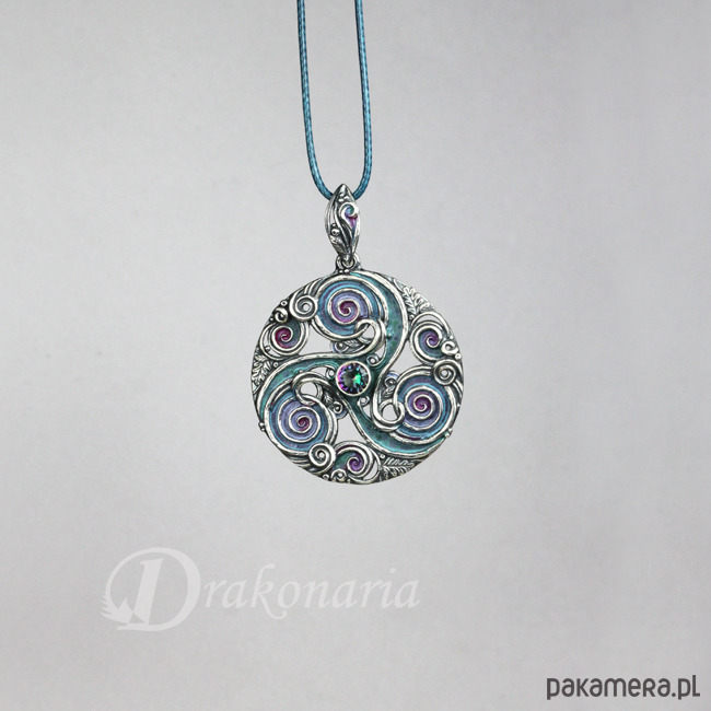 Niezwykły, pełen zadziwiających detali wisior, zaprojektowany przeze mnie od podstaw, wykonany ze srebra pr. 925, zdobiony fasetowanym topazem mystic, połyskującym fioletem, zielenią i różem. Dodatek dobranej kolorystycznie patyny idealnie dopełnia całości. Praca stanowi część mojej kolekcji symboli, celebrujących naszą więź z Naturą.