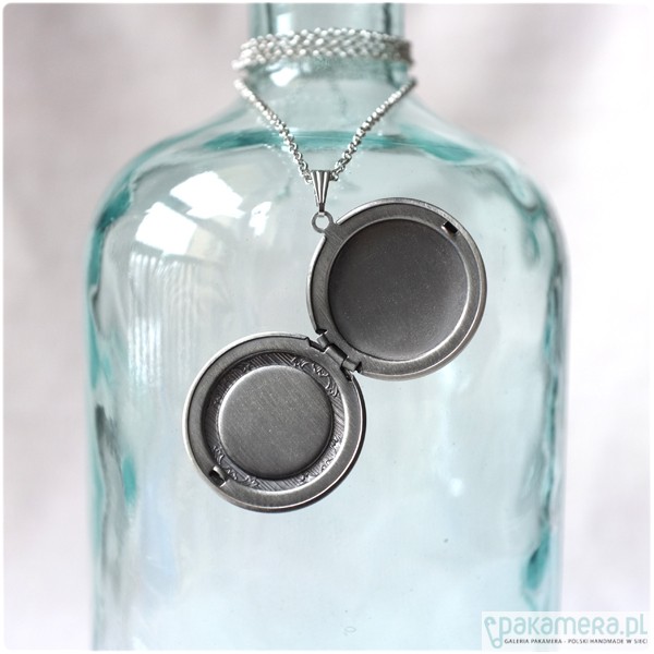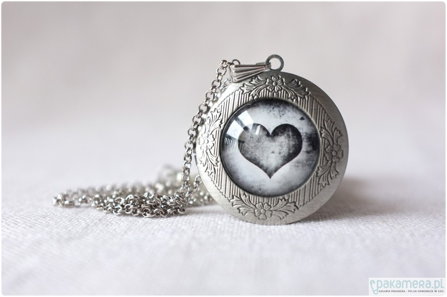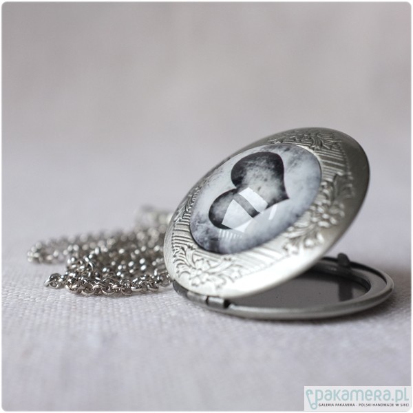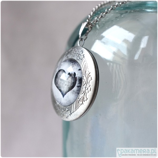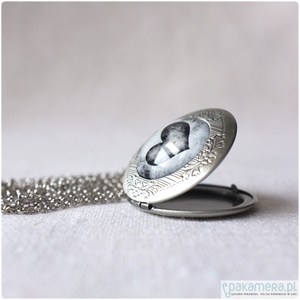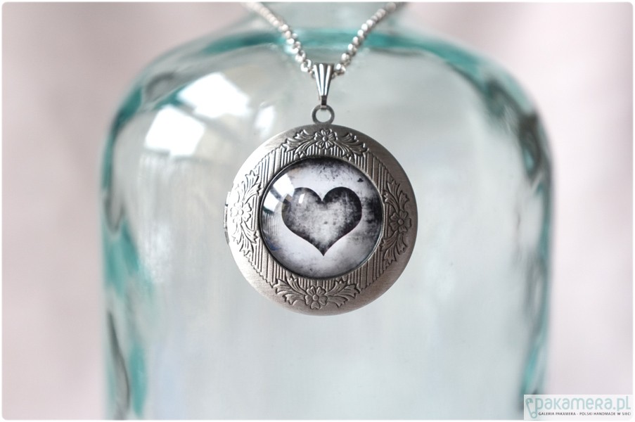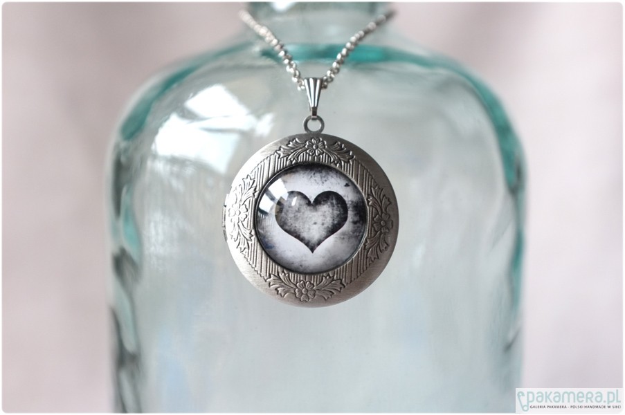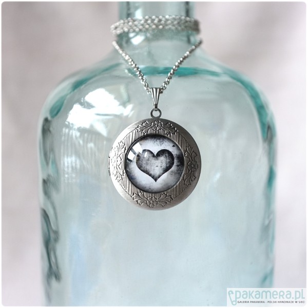 Okrągły, otwierany medalion i sekretnik w kolorze starego srebra o średnicy ok. 3,2 cm. Pod powiększającym, szklanym kaboszonem 2 cm, znajduje się czarno białe zdjęcie z sercem. Medalion zawieszony jest na łańcuszku o długości 60 cm. Bardzo dekoracyjny i bardzo wyrazisty element biżuterii!