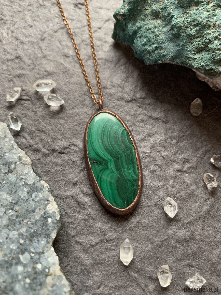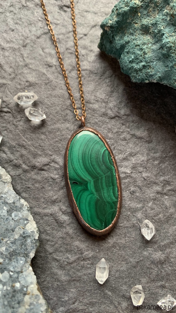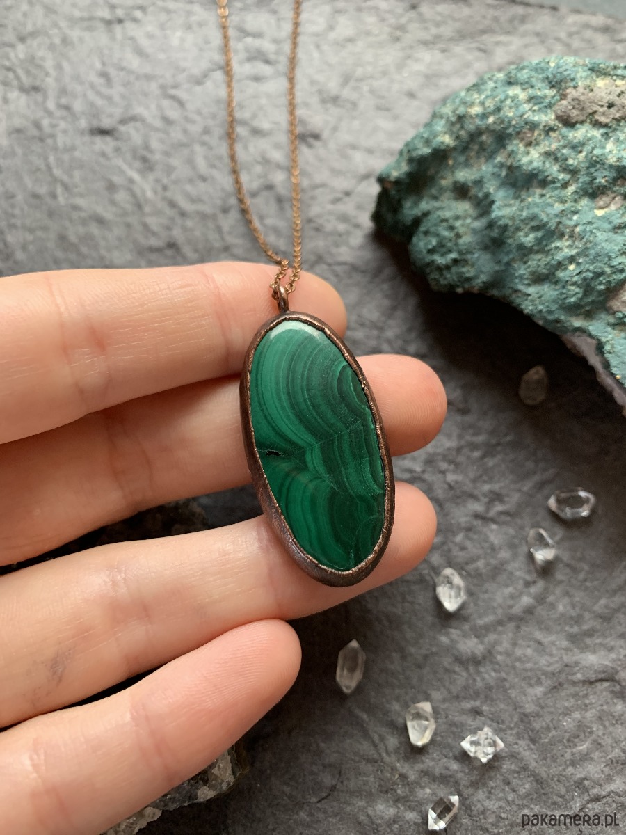 Malachit to niezwykły minerał, ma piękny, głęboki kolor, ciekawa budowę, która pomimo tego, że nie ma błysku jednak wraz z ruchem delikatnie połyskuje.