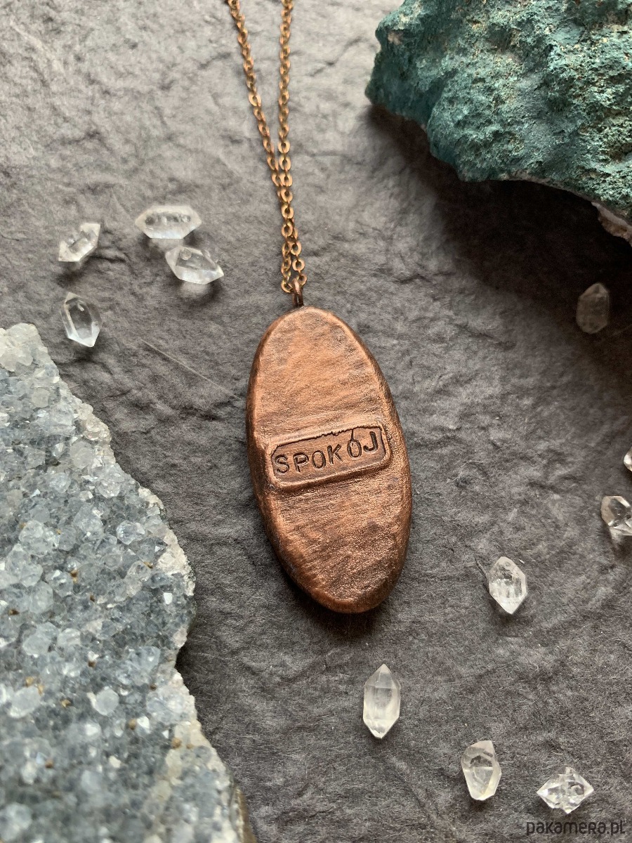 Kamień ma oprawę miedzianą, która pokryta jest brązową patyną, wypolerowana i zabezpieczona przed ścieraniem. Na odwrocie naszyjnika umieściłam intencję “SPOKÓJ” wybitą w miedzianej blaszce. Wybierz długość łańcuszka (napisz w notatce do zamówienia), jeśli nie będzie podane wyślę 50 cm. Łańcuszek jest miedziany, również przyciemniany aby dopasować kolorem do wisiora, zapięcie ze stali chirurgicznej.