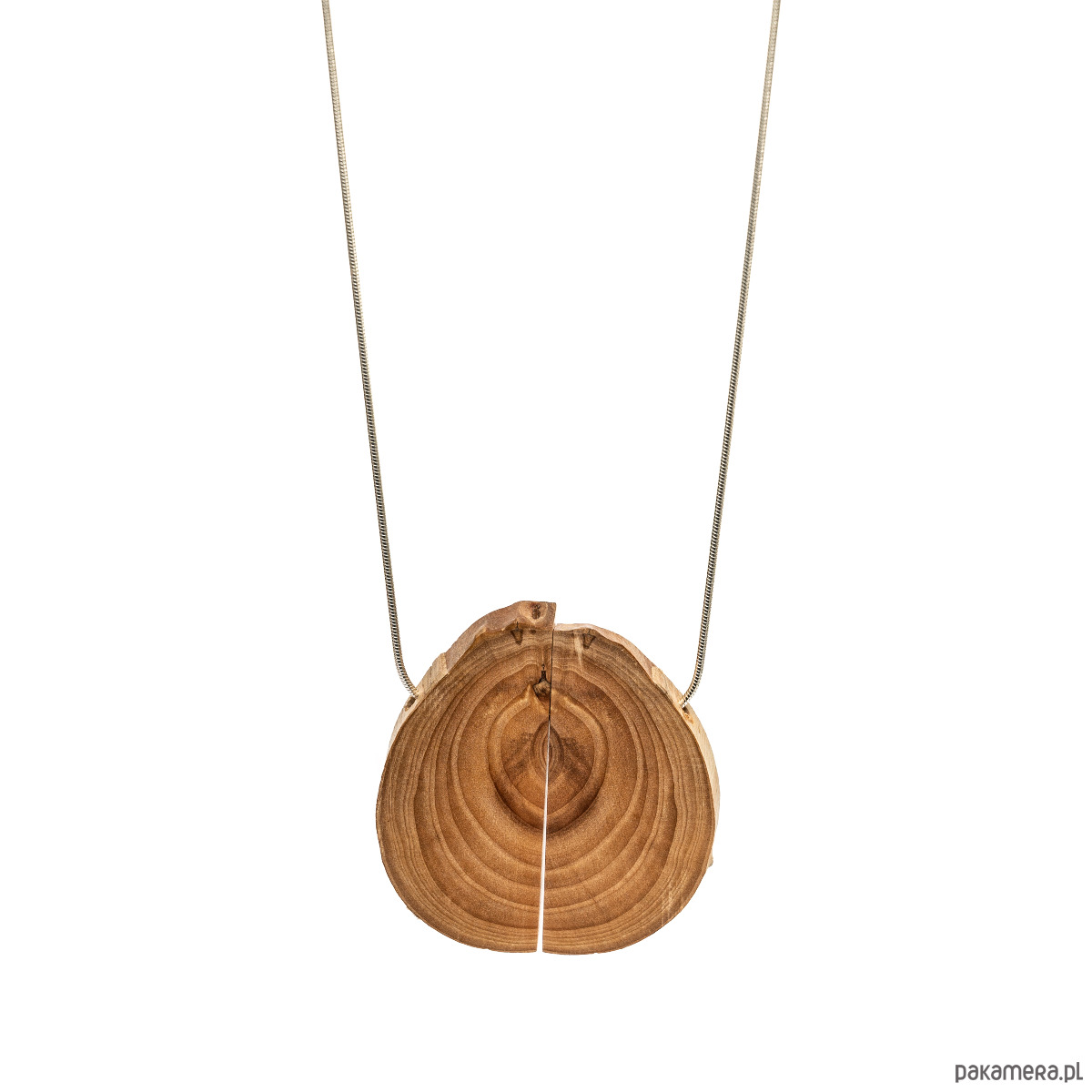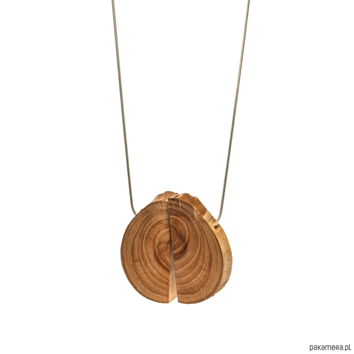 Obustronnie polerowane drewno jabłoni, nawleczone na srebrny łańcuszek.