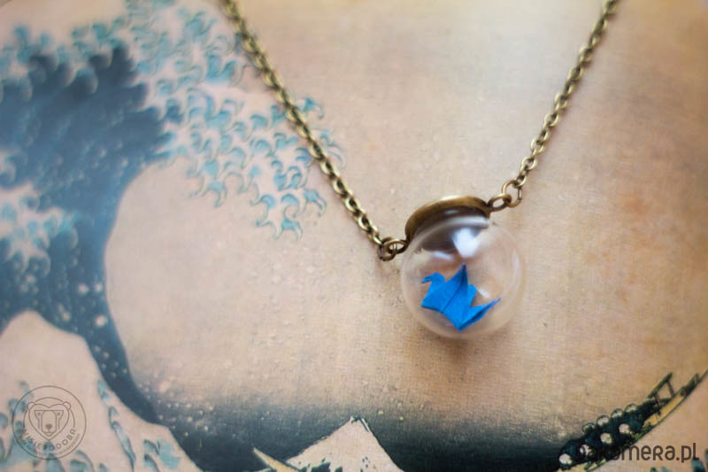 Delikatny, maleńki, papierowy żuraw - japoński symbol szczęścia, zdrowia i pokoju. Podobno, jeśli w jakiejś intencji złoży się tysiąc żurawich figurek, to życzenie się spełni. My spełniamy życzenia tym zjawiskowym wisiorkiem. Papierowy żuraw ukryty w szklanej kuleczce o najszerszej średnicy 2 cm. Część ozdobna zawieszona na łańcuszku o długości 37 cm. Całość w kolorze starego złota/brązu.