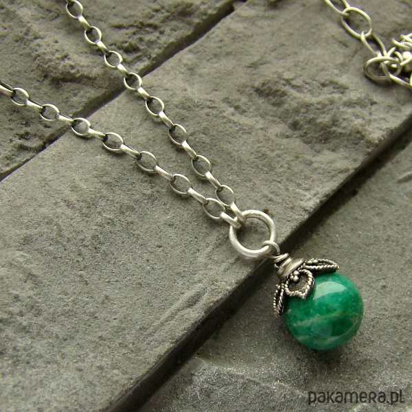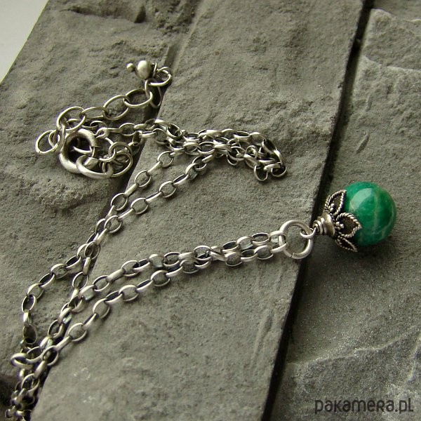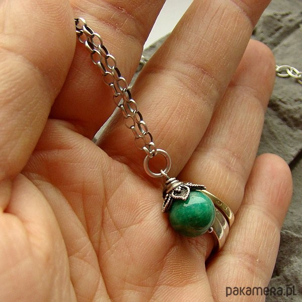 Subtelny i kobiecy naszyjnik na co dzień i nie tylko. Wykonany w całości z oksydowanego srebra próby 925 oraz kuli amazonitu rosyjskiego wielkości ok. 1 cm. Komie został ozdobiony,unikatową, misterną nakładką . Długość łańcuszka to 44 cm plus regulacja 5 cm. Ozdobnie zapakowany.