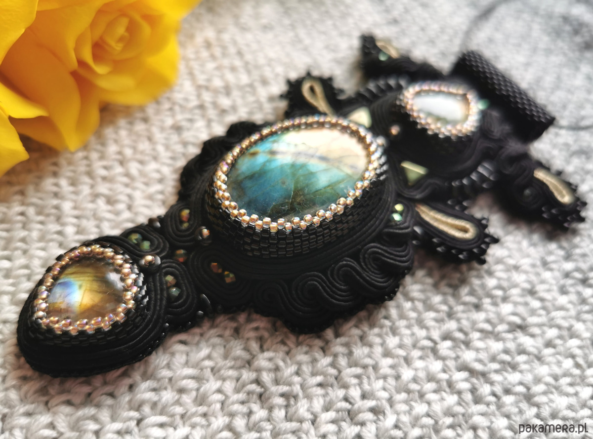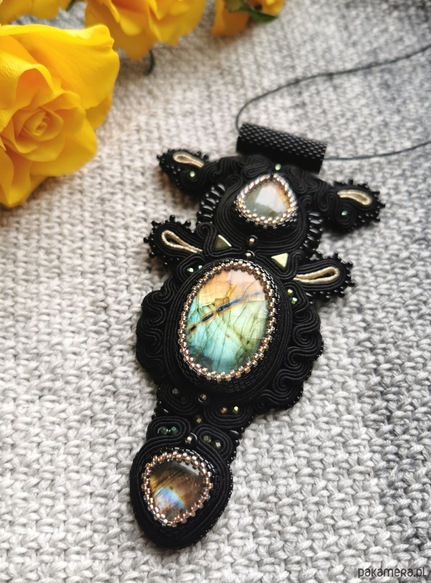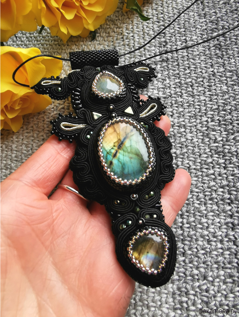 Wisior wykonałam najlepszej jakości sznurków do sutaszu, czeskich szklanych koralików, fasetowanych kuleczek hematytu i trzech labradorytów.