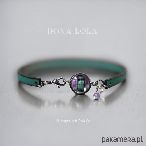 Oryginalna delikatna, kobieca bransoletka z kolekcji Dona Lola. Grafika została ukryta pod 10 mm wypukłym szkiełkiem. Pasek w kolorze morskiej zieleni ma szerokość 5 mm, dodatki w kolorze ciemnego srebra. Idealna na nadgarstek 16 -17 cm. Wolny od niklu i ołowiu - antyalergiczny. copyright Ewa Saj. All Rights Reserved.