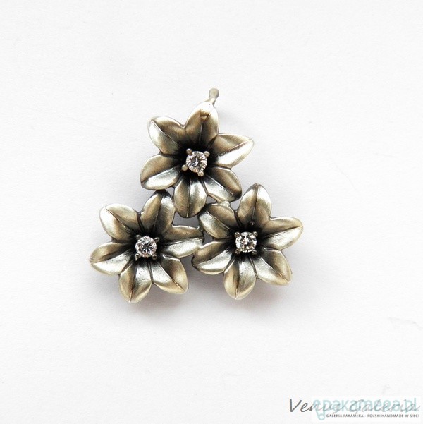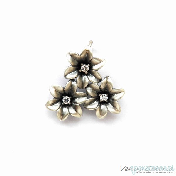 Elegancka zawieszka srebrna w kształcie trzech kwiatuszków. Zawieszka pokryta jest oksydą i wypolerowana. W każdym kwiatuszku umieszczona biała cyrkonia. Długość zawieszki: 2,5 cm. Szerokość 2,5 gr. Waga:2,8 gr.