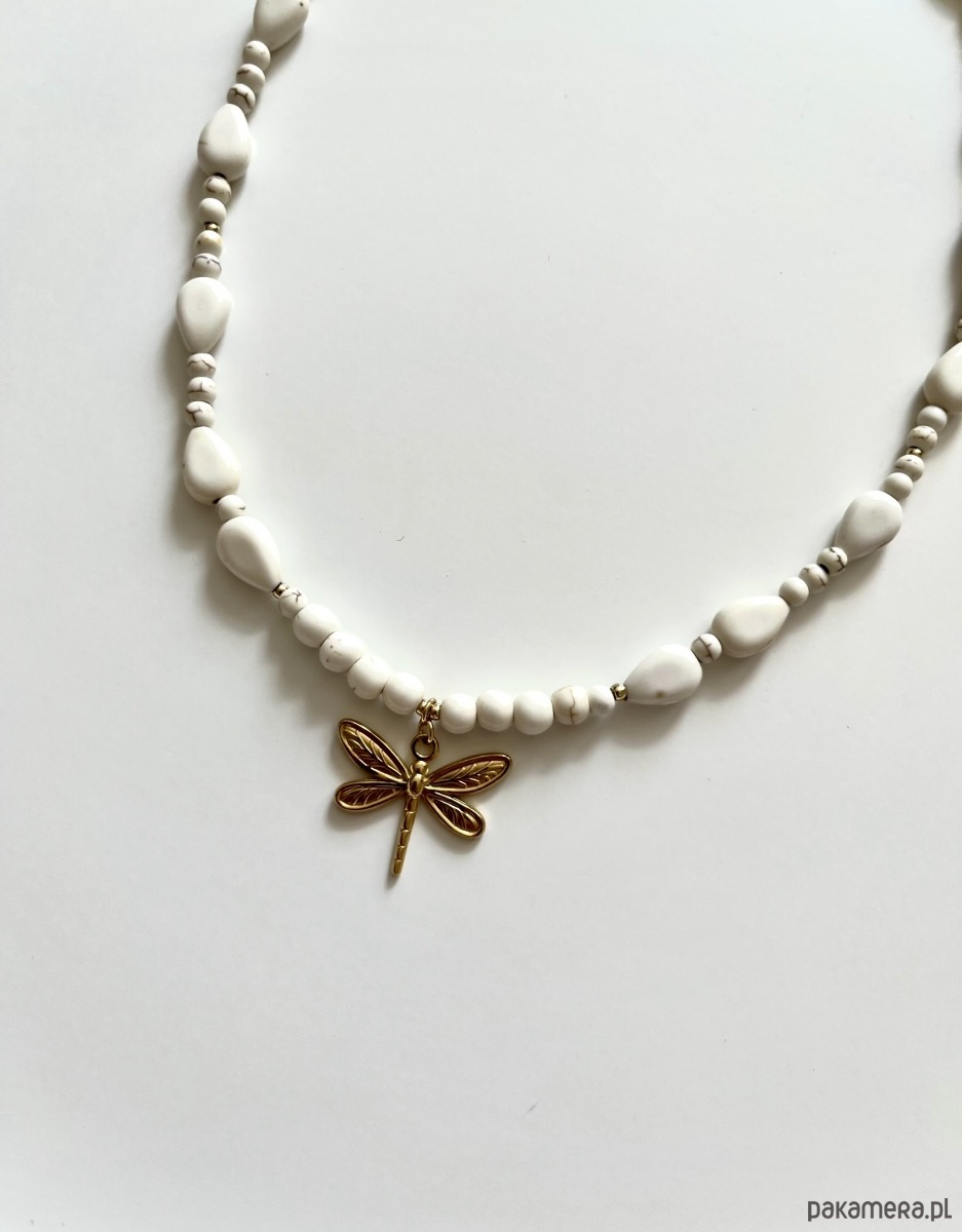 Naszyjnik Dragonfly to subtelny i kobiecy naszyjnik wykonany z naturalnego kamienia – howlitu w kolorze ecru.  Całość dopełniają elementy oraz zapięcie ze stali chirurgicznej, która jest odporna na korozję, nie uczula i zachowuje blask przez długi czas.