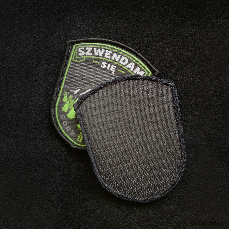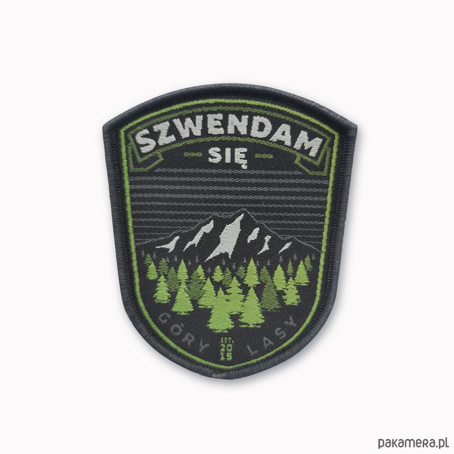 Naszywka w czarnym kolorze w kształcie tarczy z wyhaftowanym napisem Szwendam się oraz masywem górskim u podnóża, którego rośnie gęsty las iglasty. Emblemat został wyposażony w jednostronny rzep, dzięki któremu w szybki i prosty sposób zaczepisz go np.: na plecak, nerkę, czapkę lub inny rodzaj odzieży z odpowiednim do tego panelem z rzepu miękkiego (tzw. pętelka). Wymiary naszywki: 7,5 x 6 cm.