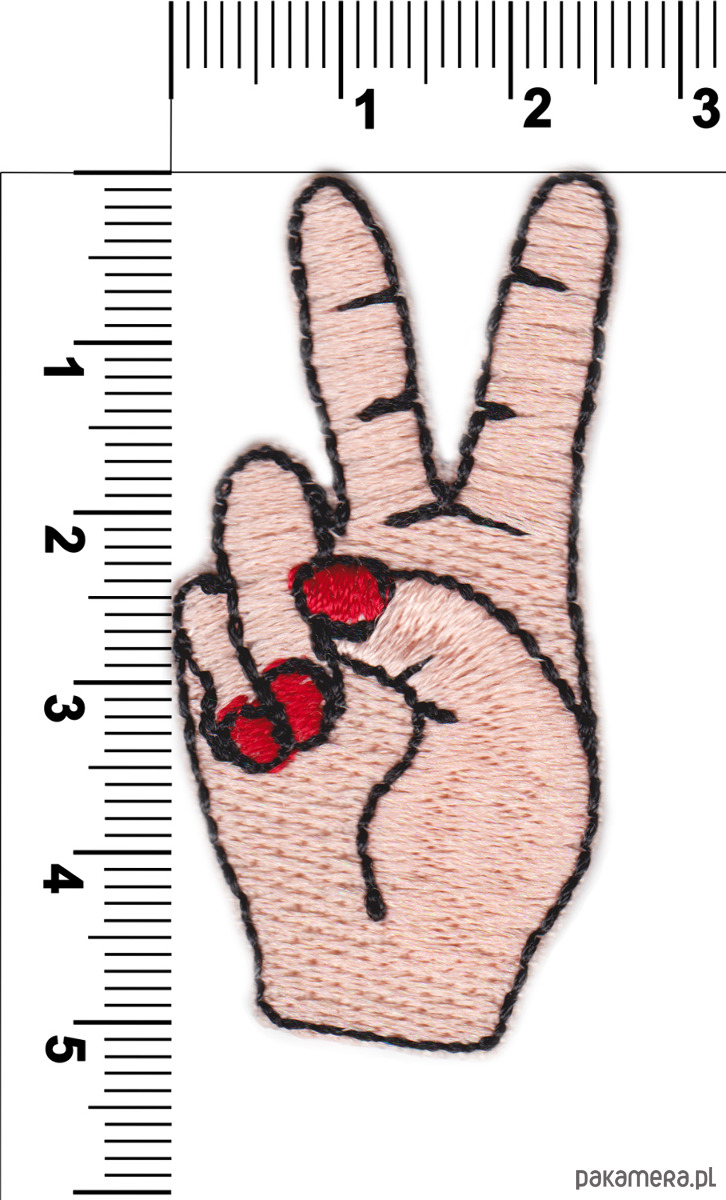 Oryginalna naszywka haftowana przedstawiająca dłoń pokazującą znak „V” (Peace / Victory). Precyzyjny haft komputerowy oraz kontrastowe kolory sprawiają, że naszywka wyróżnia się na odzieży i dodatkach. Motyw dłoni z czerwonym lakierem na paznokciach nadaje całości nowoczesny i lekko pop-artowy charakter.
